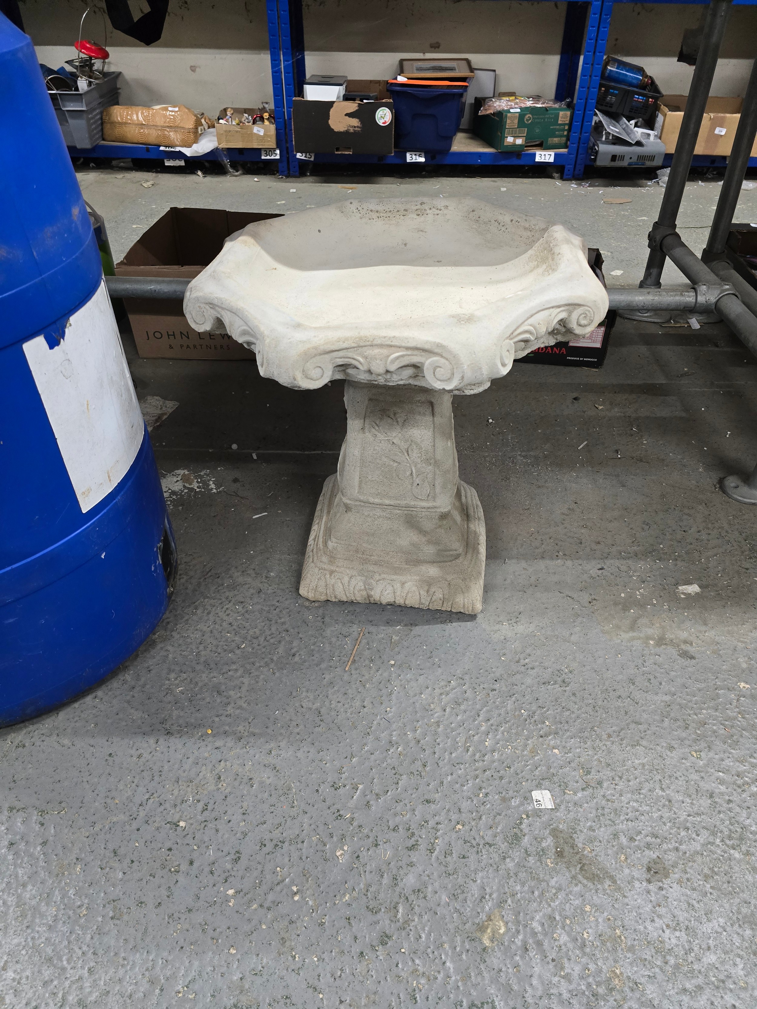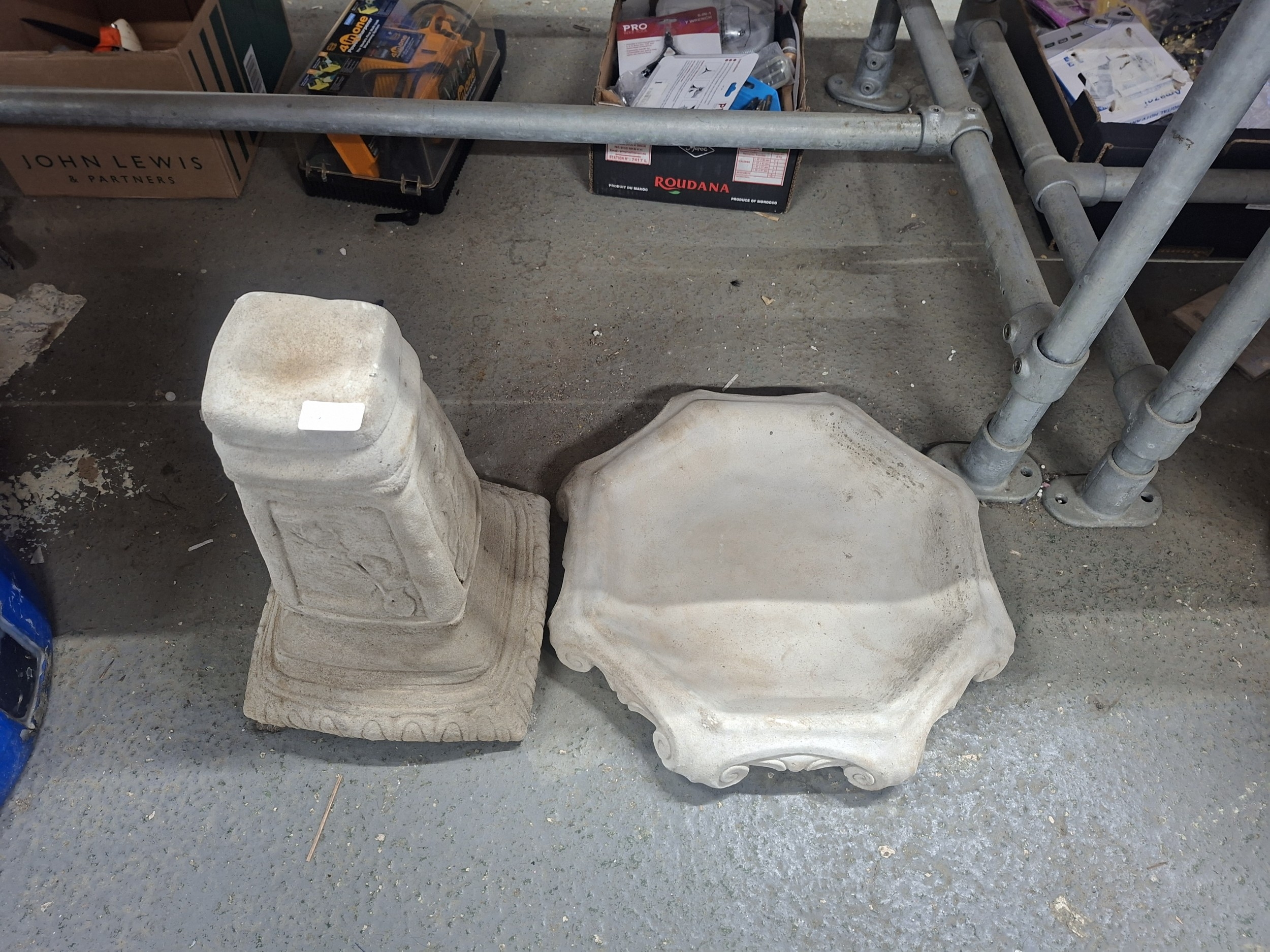 Two-piece concrete birdbath with octagonal basin and square pedestal showing minor wear.
