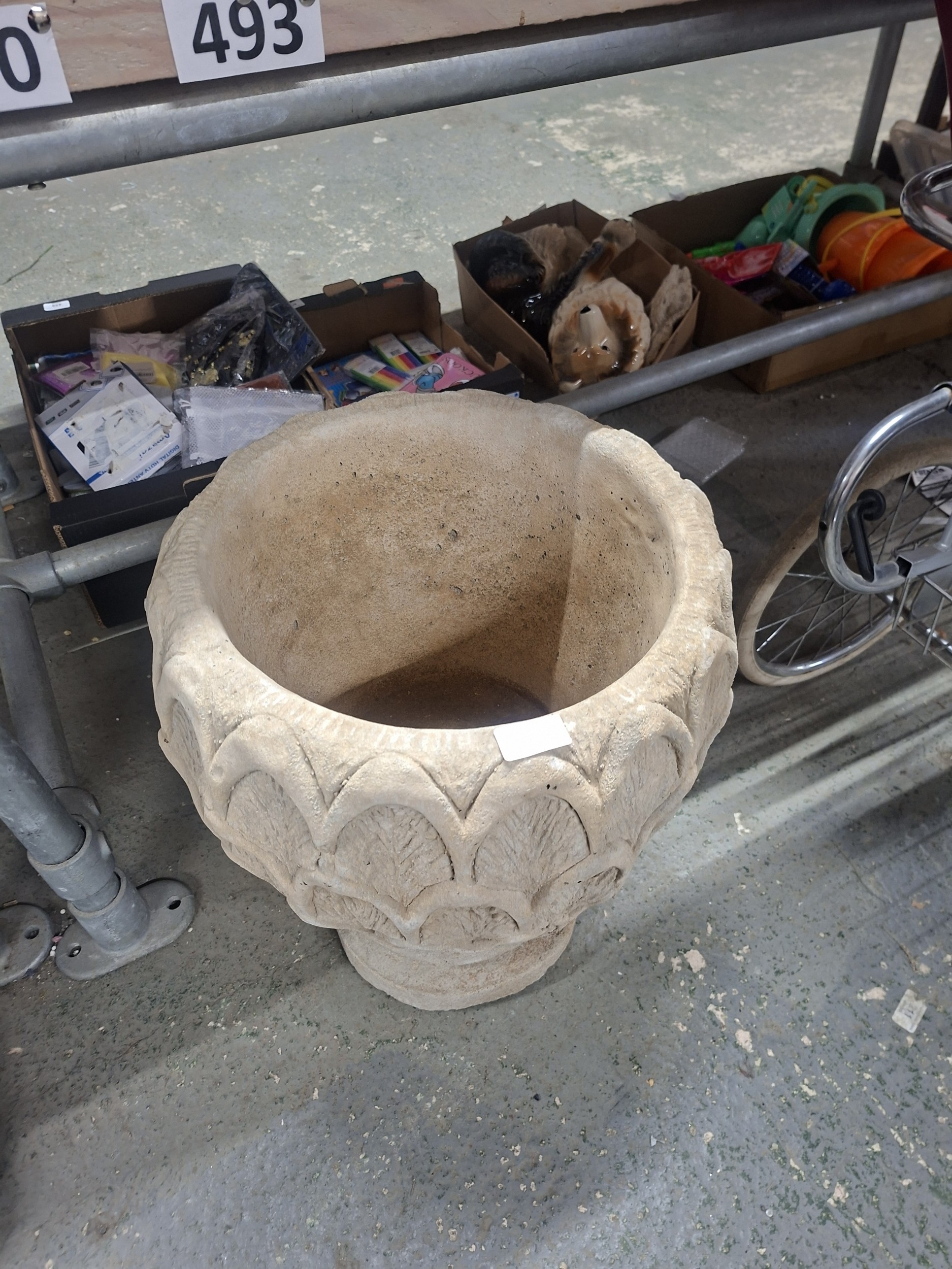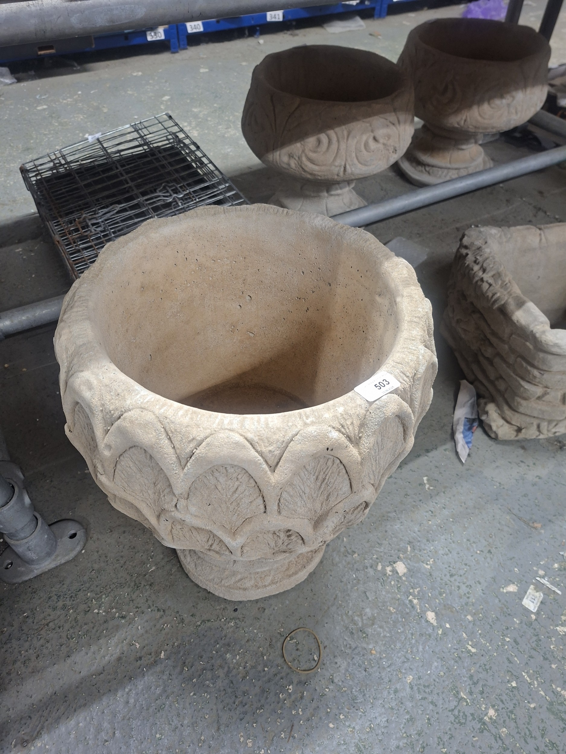 A large, light beige stone or concrete bowl-shaped planter with leaf-pattern detailing shows minor discoloration.