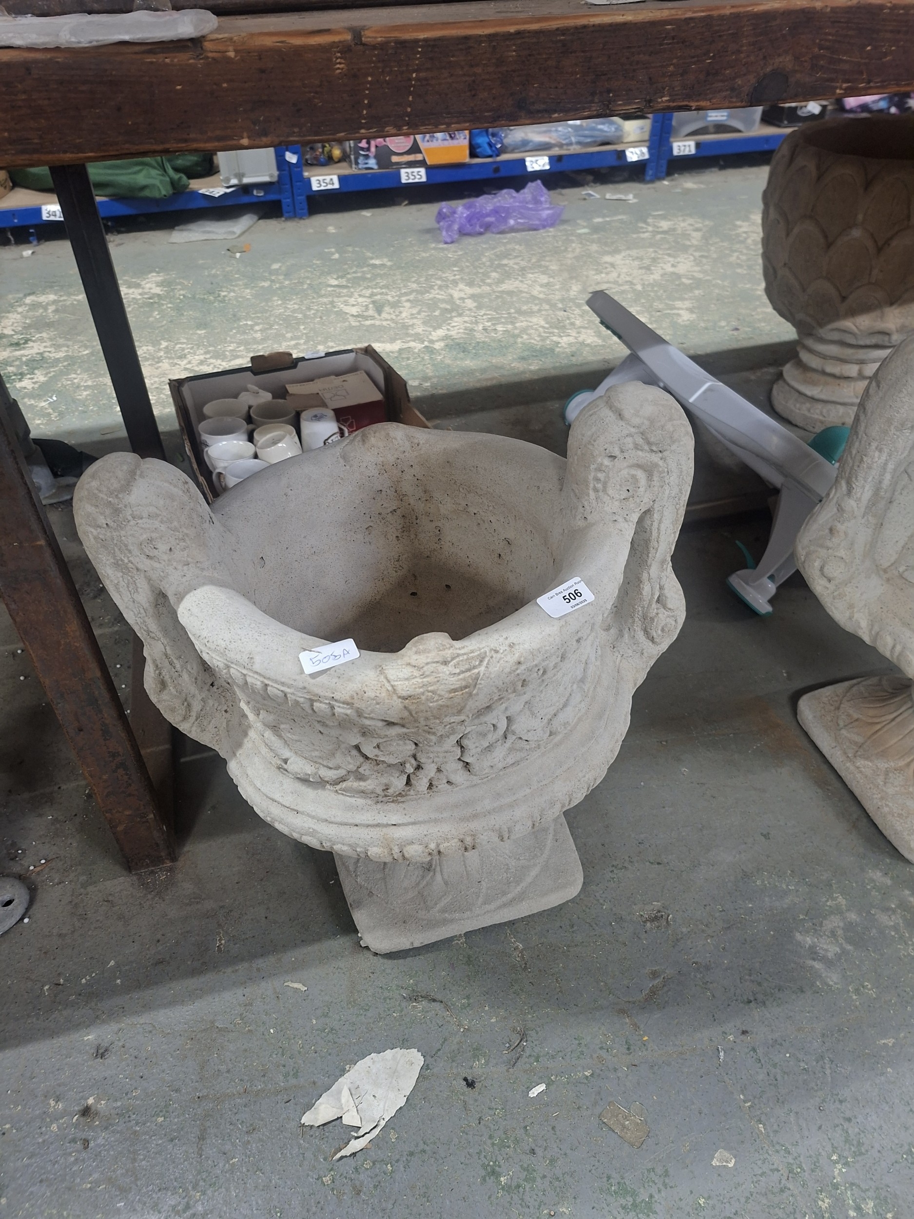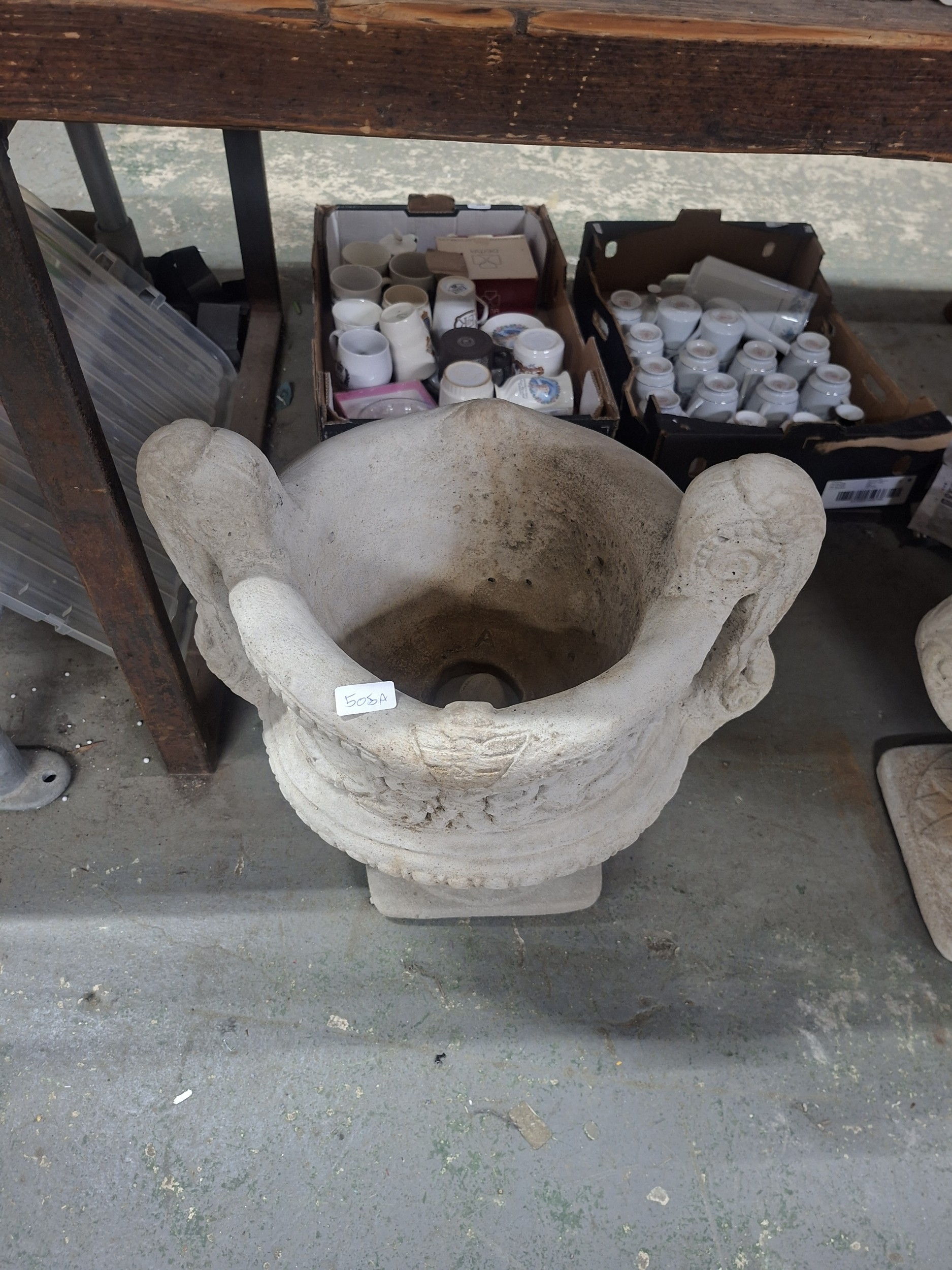 A light gray stone planter with swan handles and carved detailing shows minor wear.