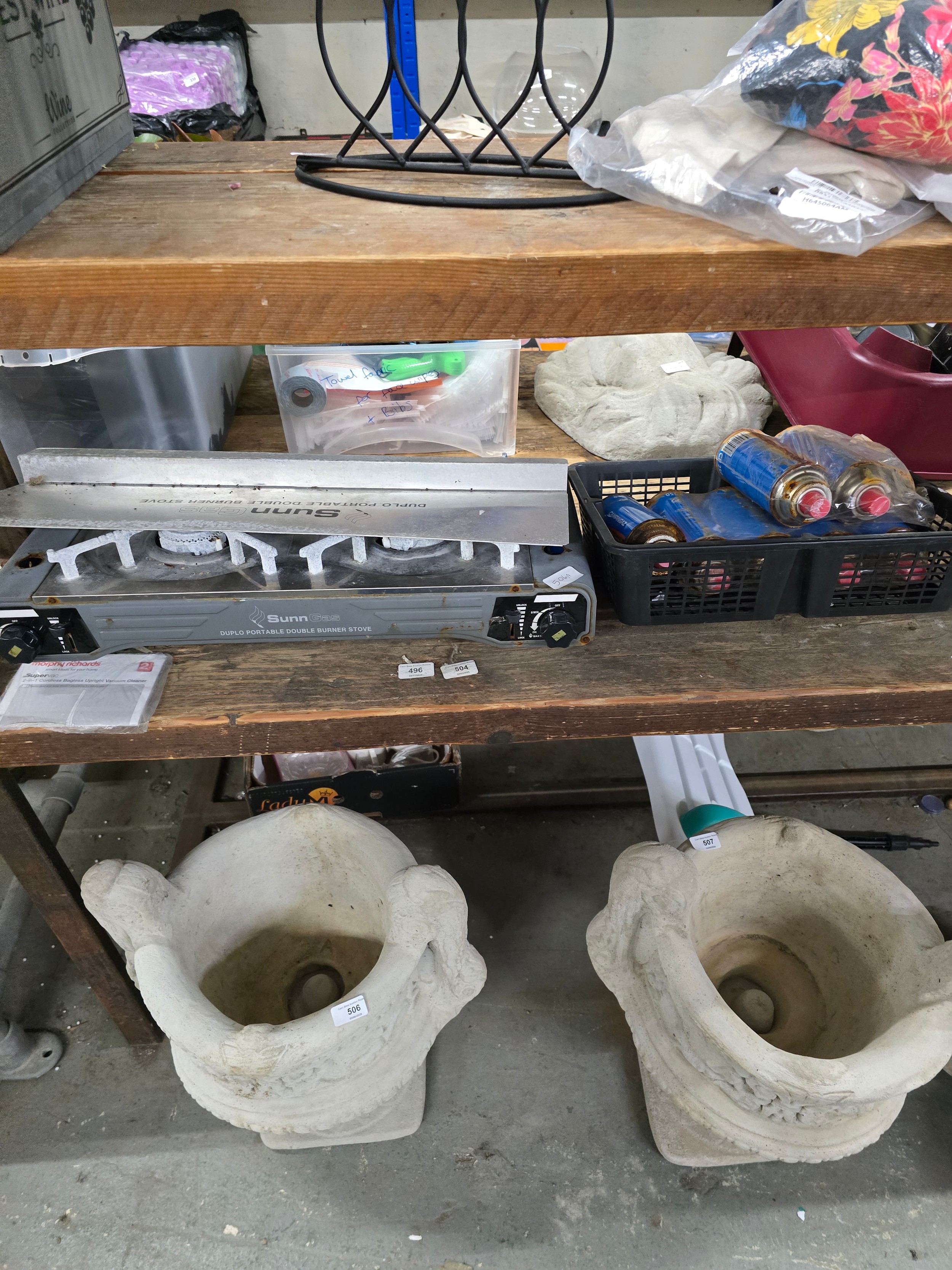 Lot includes a Sunn Gas Duplo stove, Campingaz fuel canisters, stone planters, and miscellaneous items.