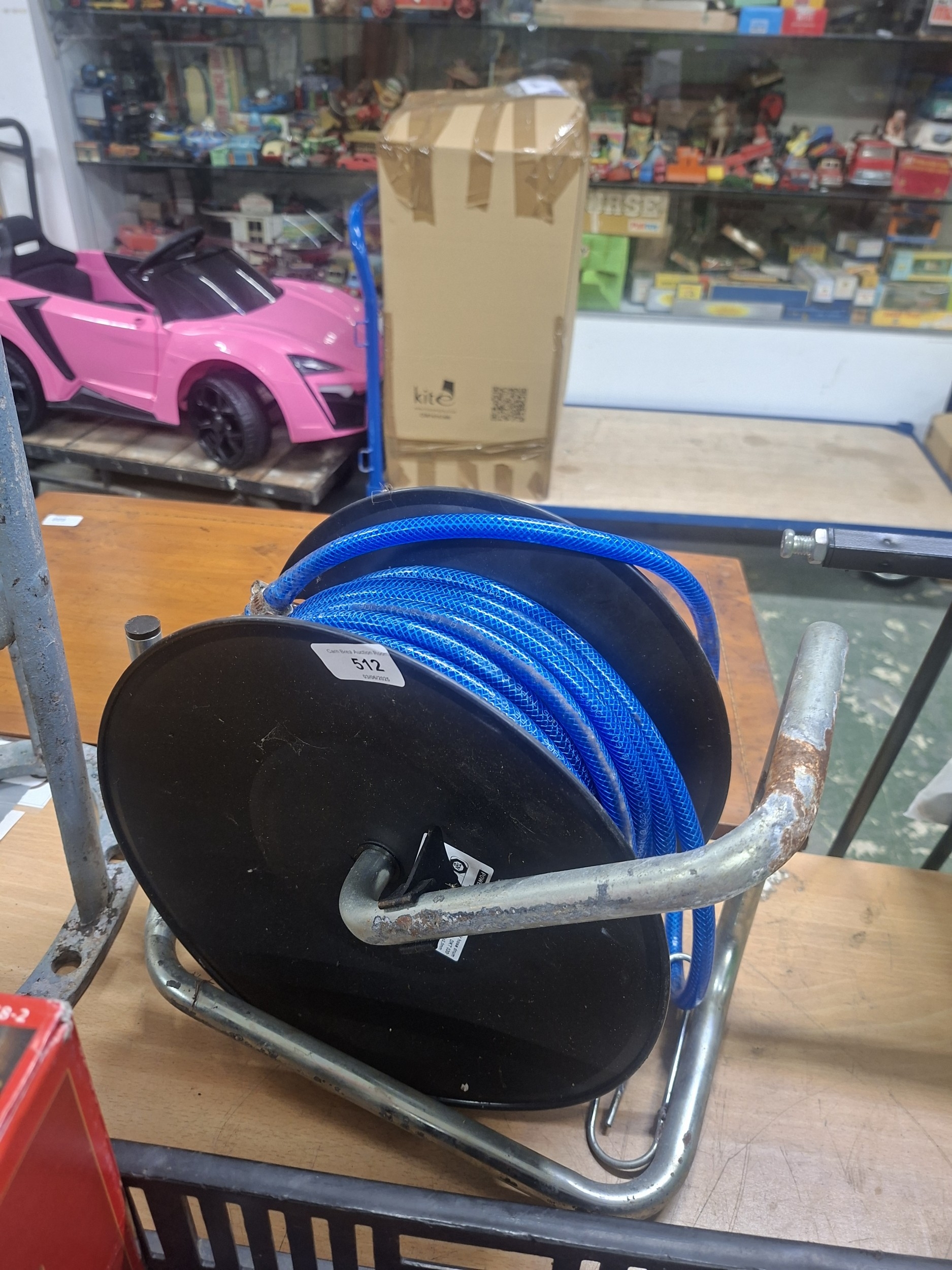 Black plastic hose reel with a rusty metal handle containing a bright blue hose.