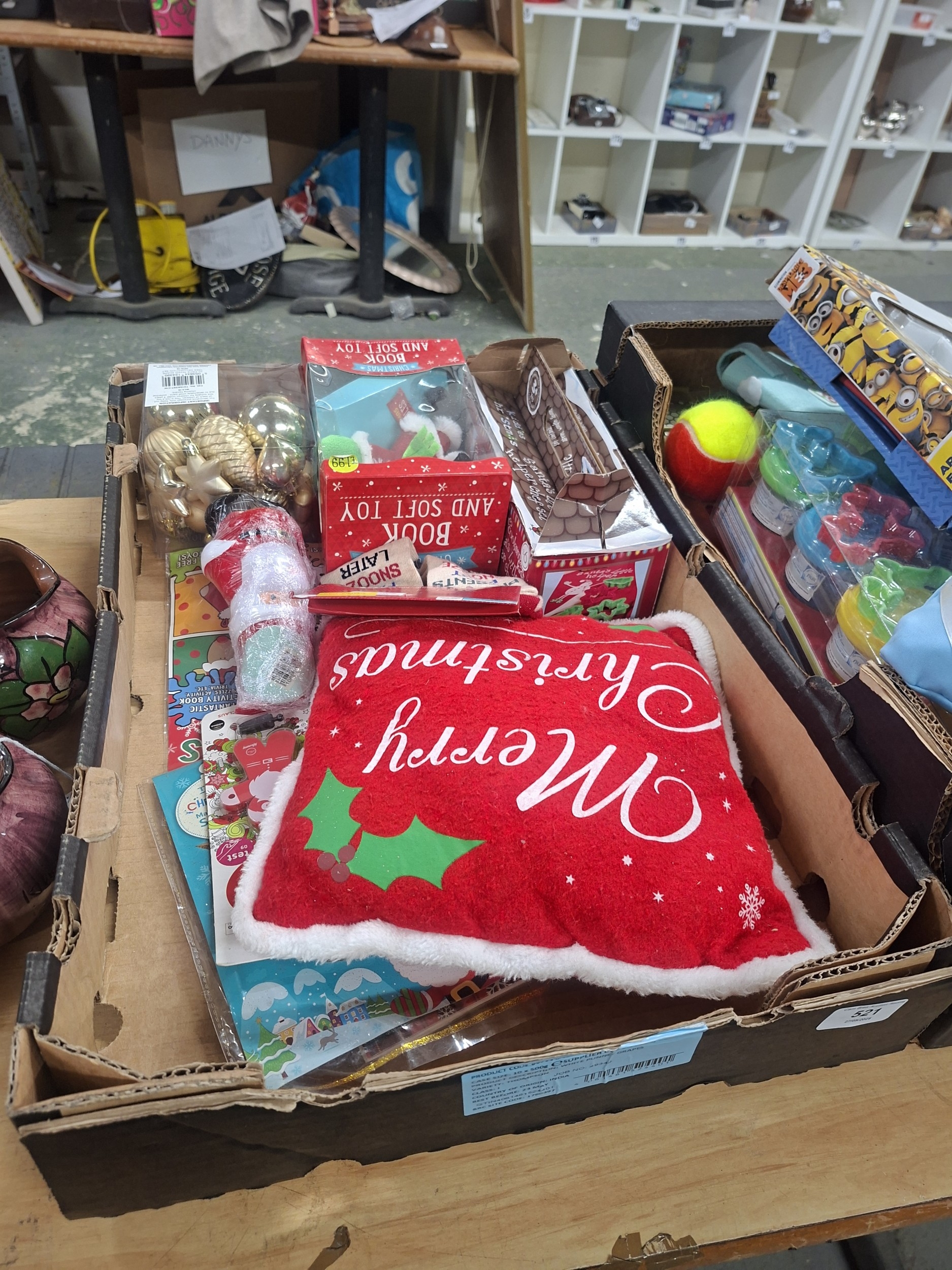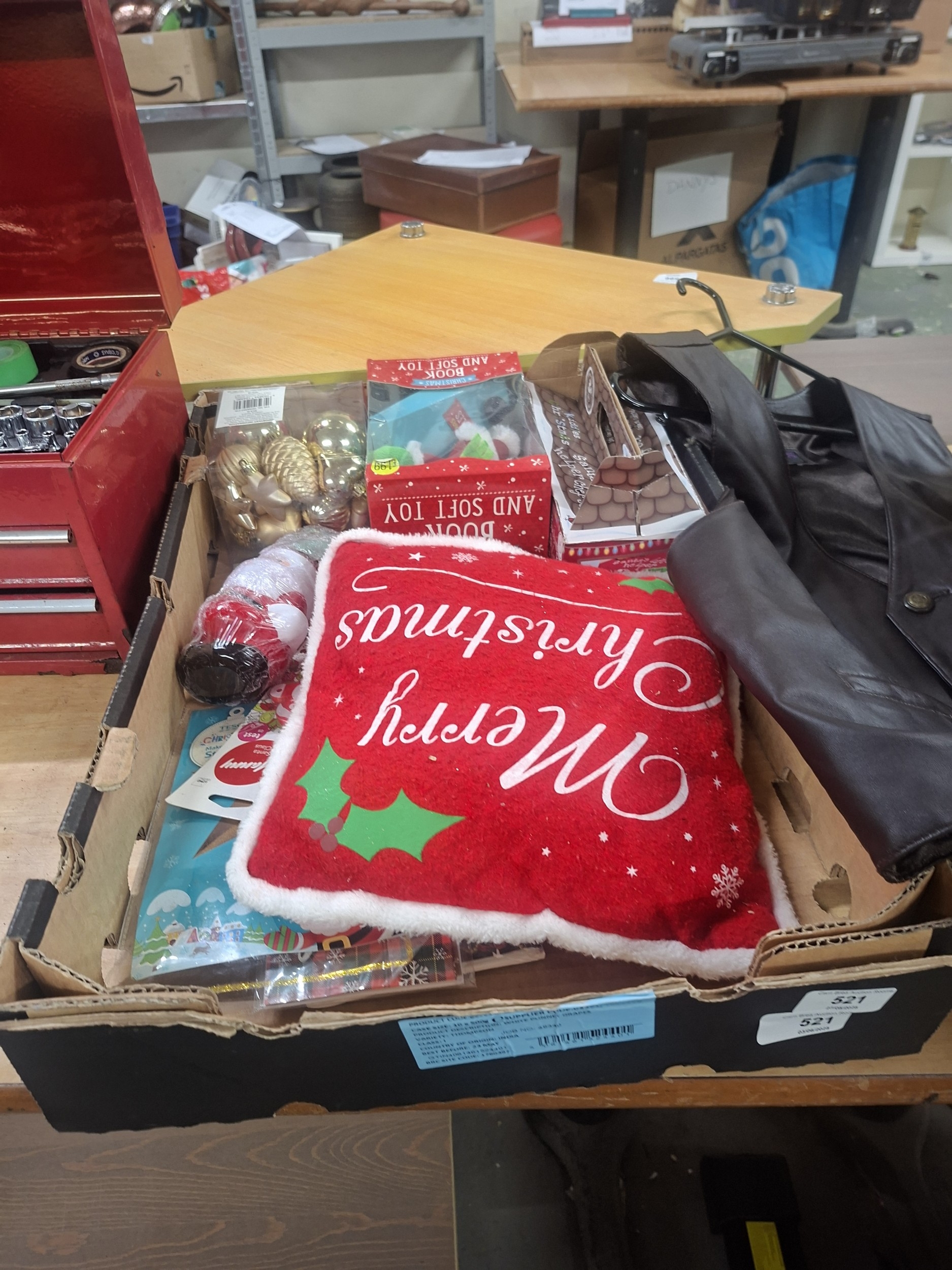 A cardboard box containing a Christmas pillow, ornaments, a Santa figurine, children’s crafts, and other miscellaneous items.