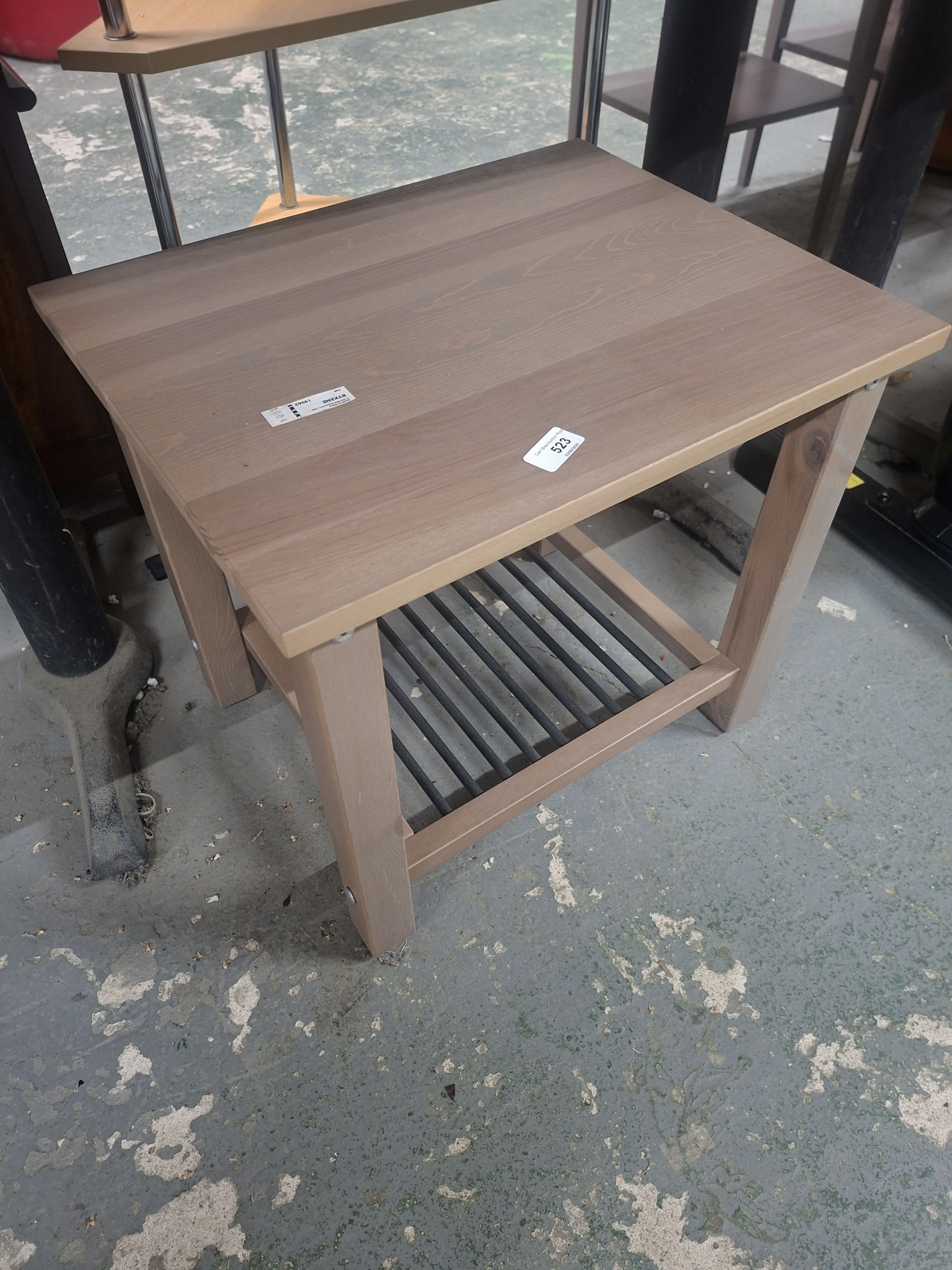 Light taupe wooden side table with a lower shelf of dark gray/black rods.