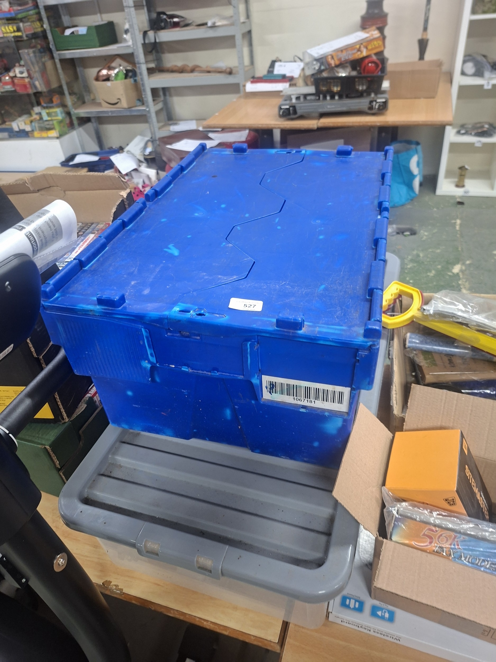 A blue plastic container with lid shows light scuffing and sits atop a gray plastic container.