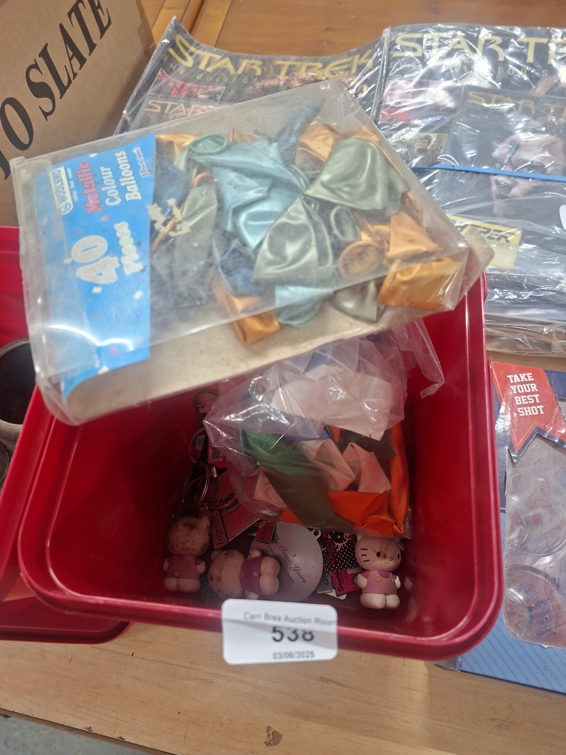 A red bin contains 40 partially deflated metallic balloons, fabric scraps, and Hello Kitty keychains, plus other items.