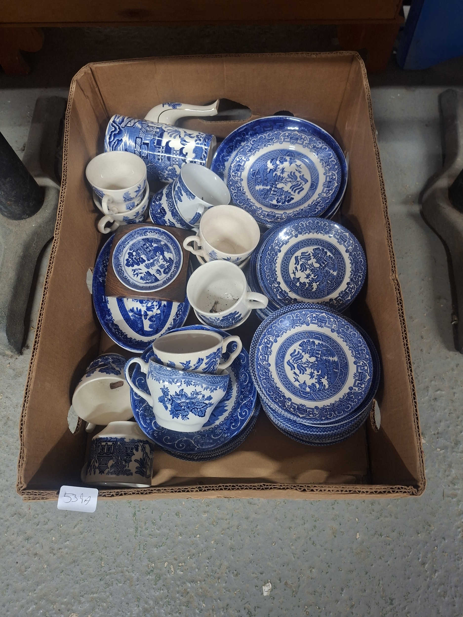 Collection of used blue and white Willow Pattern ceramic tableware in a cardboard box.