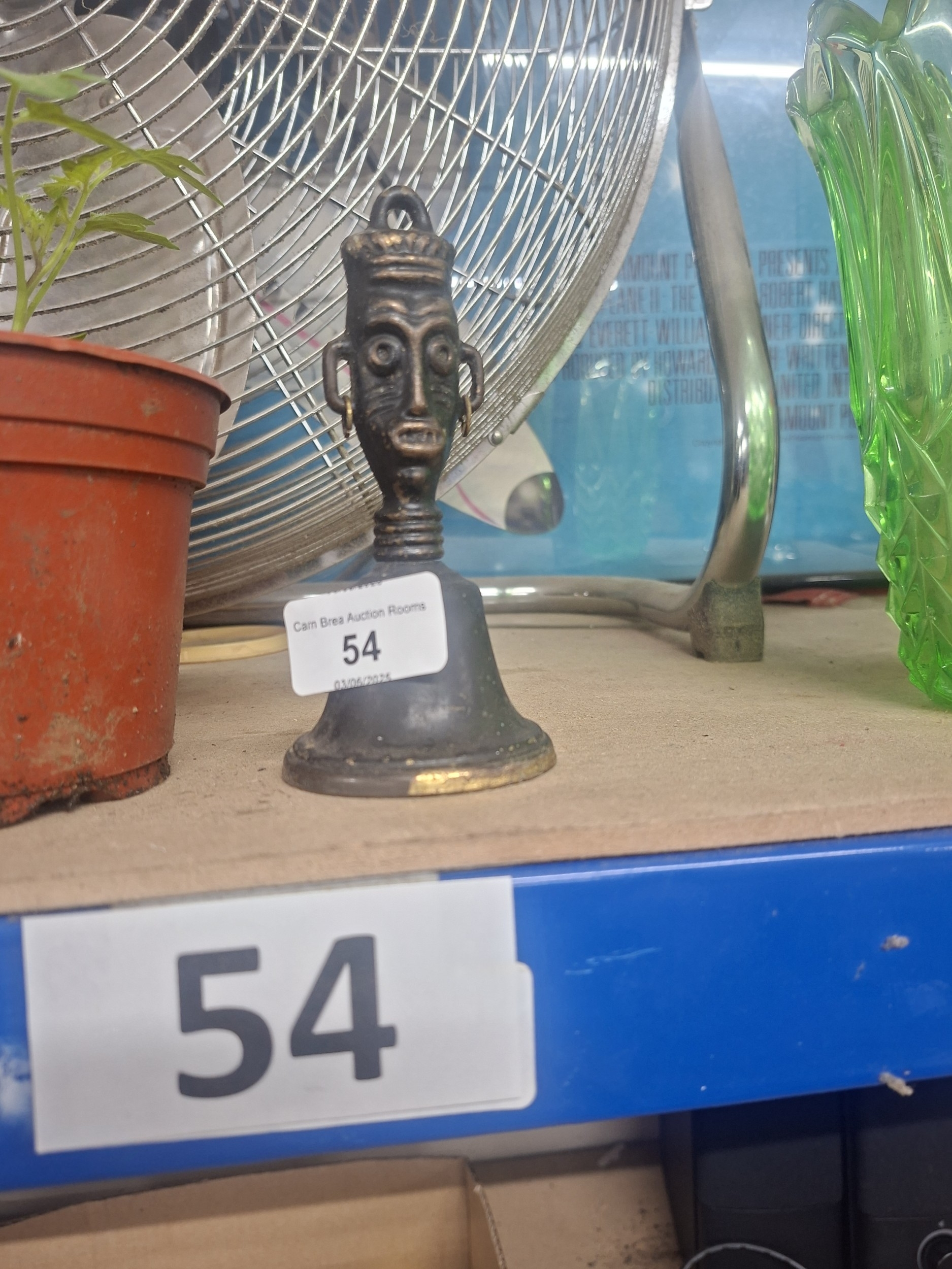 A small, dark bronze bell with a sculpted head featuring stylized African-inspired facial details and minor wear.