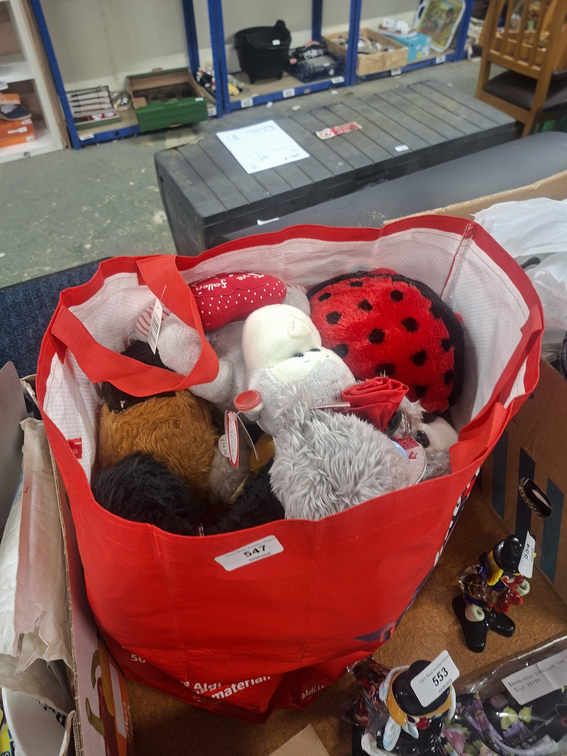 A red Aldi reusable shopping bag containing assorted plush toys.