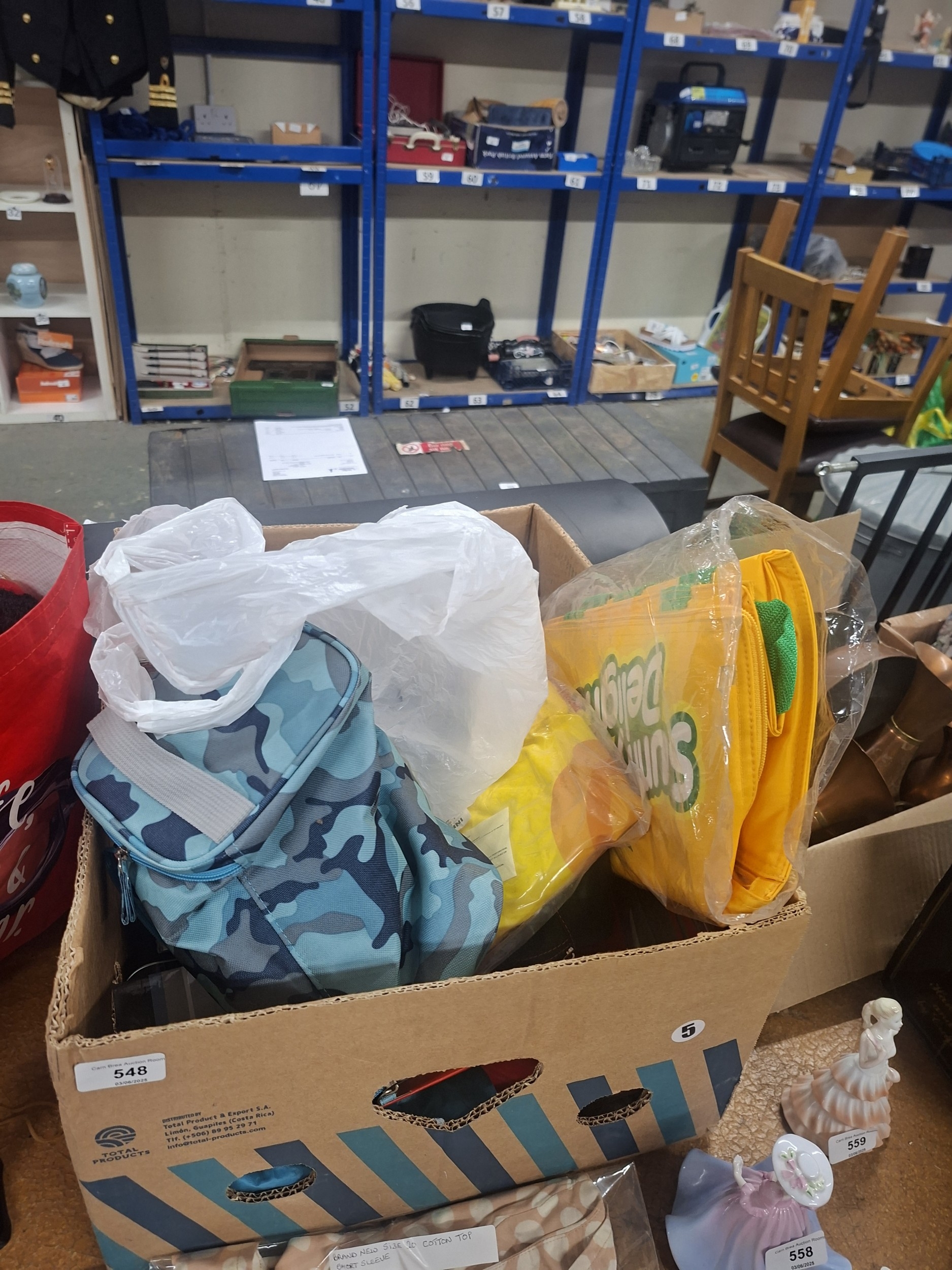Cardboard box (03/06/2025) contains camouflage, yellow, and other fabric bags and items.