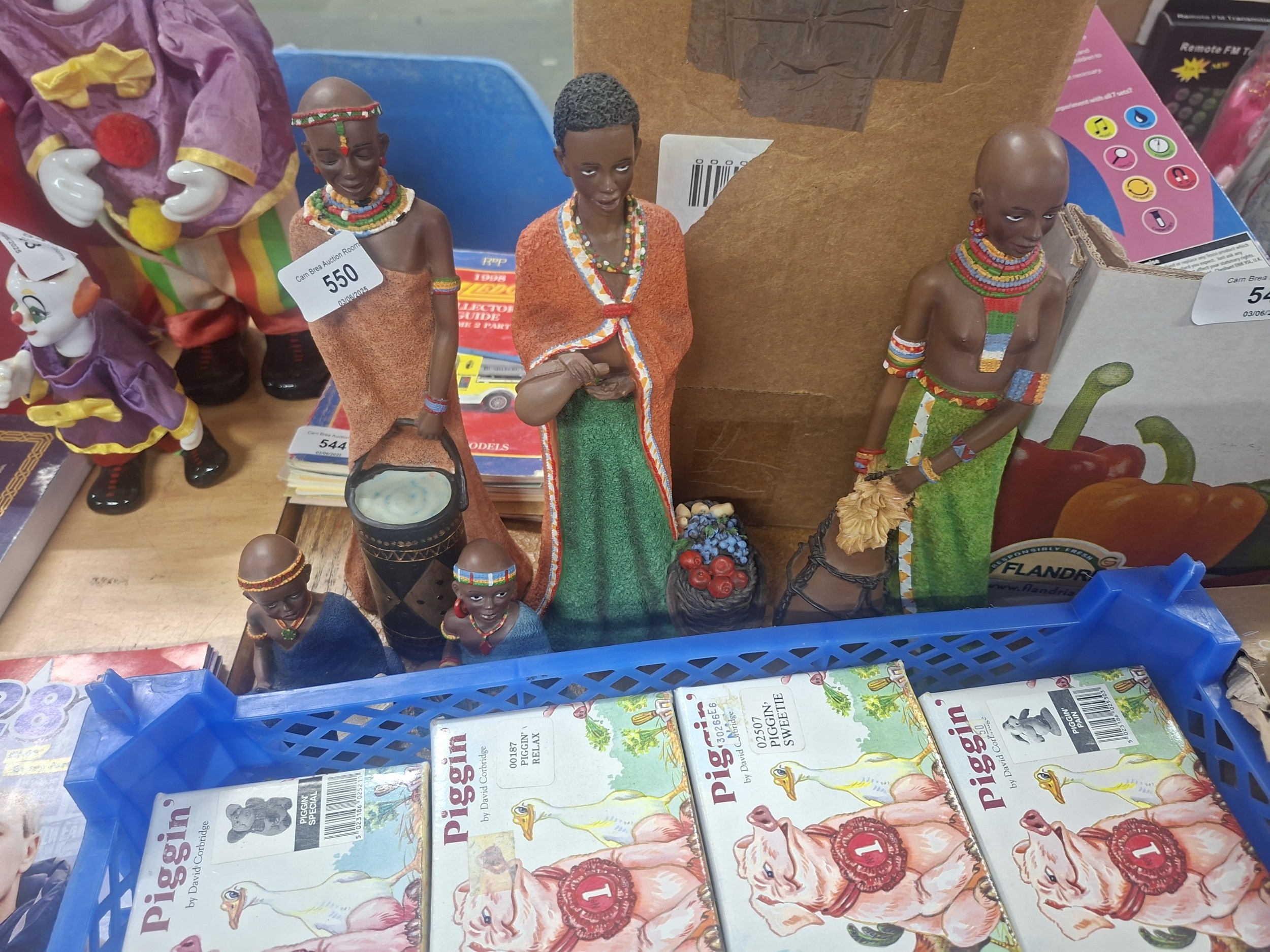 Set of four dark brown resin figurines depicting stylized figures in African attire.
