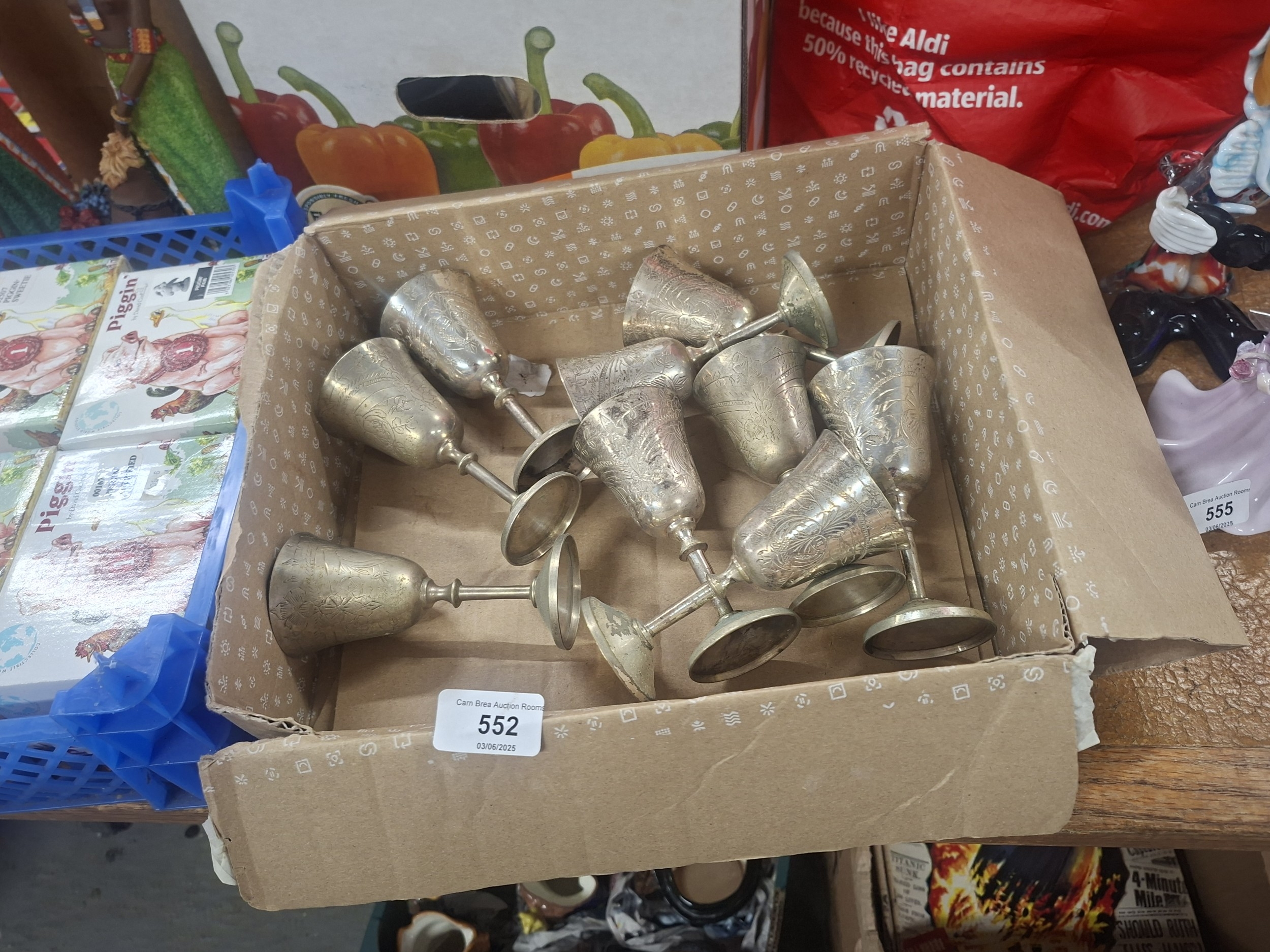 Set of ten bell-shaped silver-tone metal cups with engraved floral designs, showing some wear, in a cardboard box.