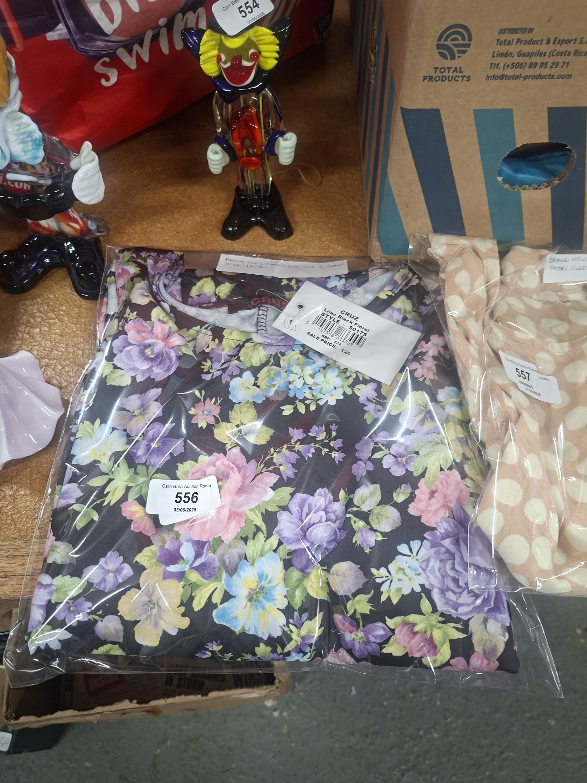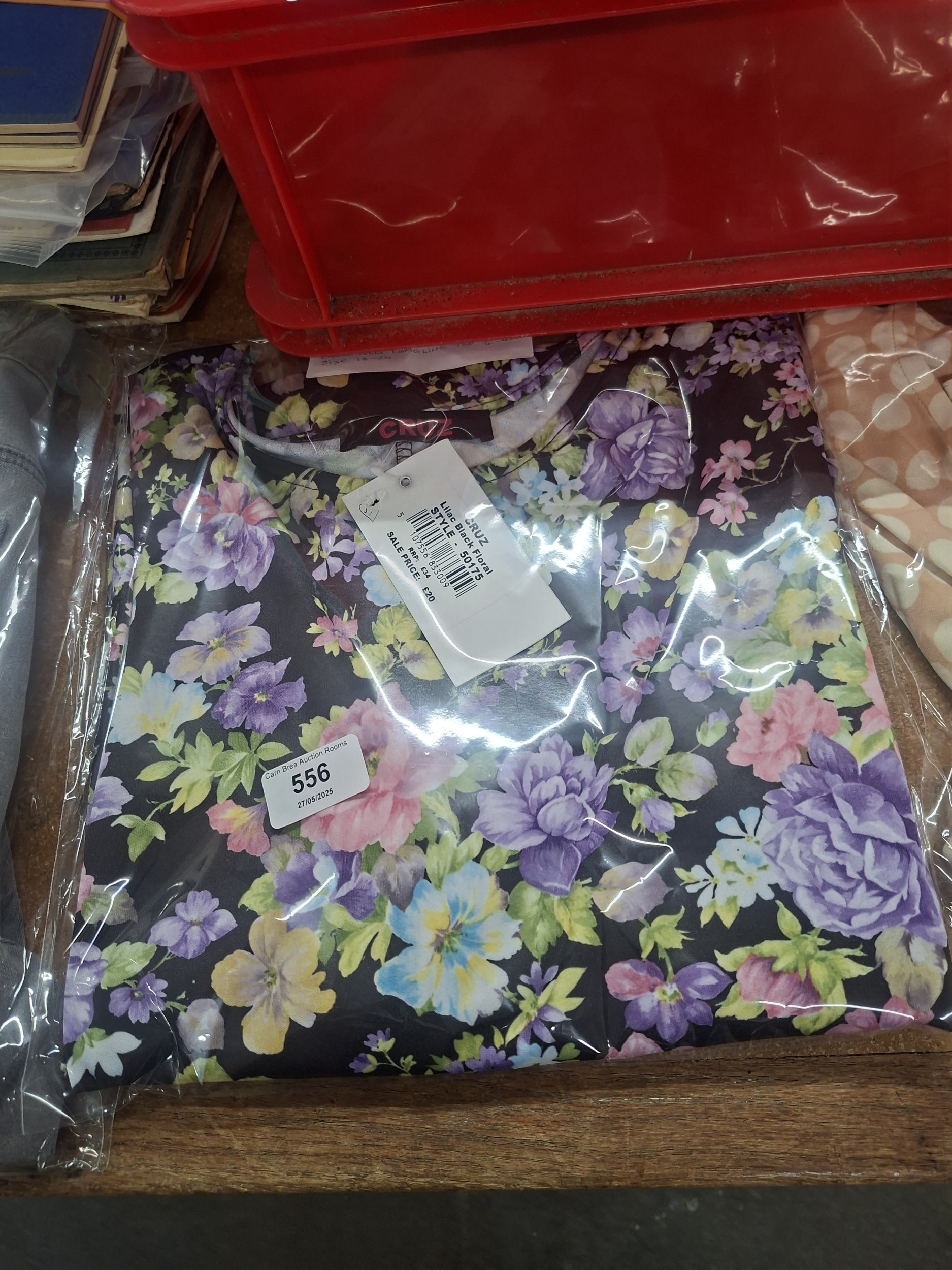 New, dark-colored floral garment (possibly a dress or shirt) size XL, sealed in plastic.
