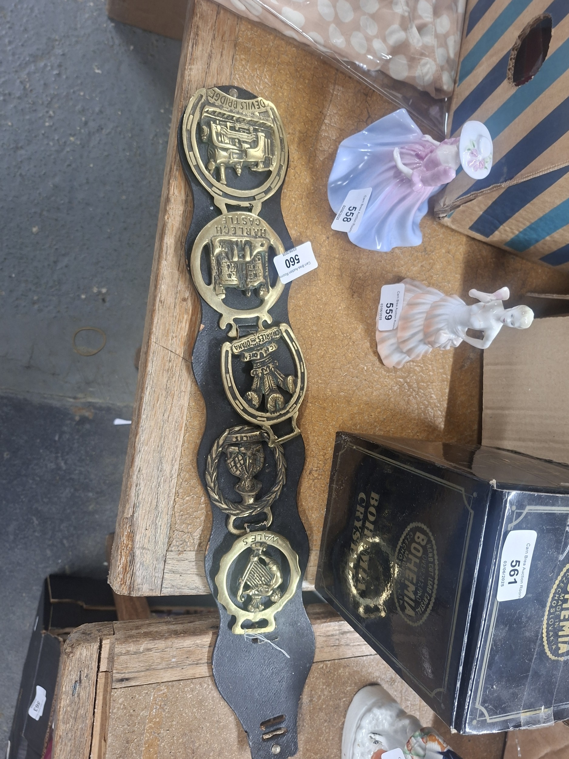 A black leather strap holds five brass horse brasses depicting Welsh landmarks and symbols.