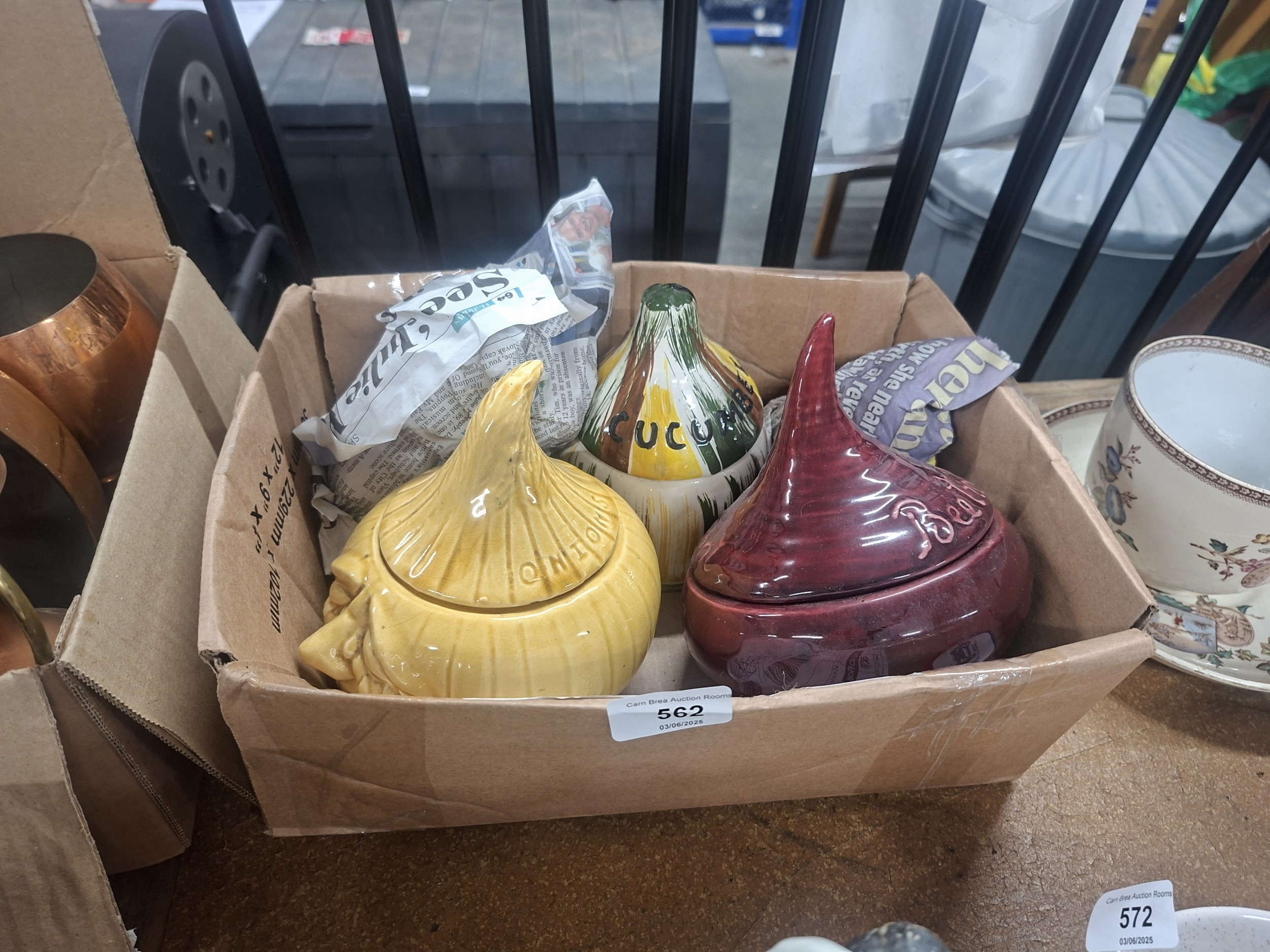 Set of three glazed ceramic onion containers in a worn cardboard box.