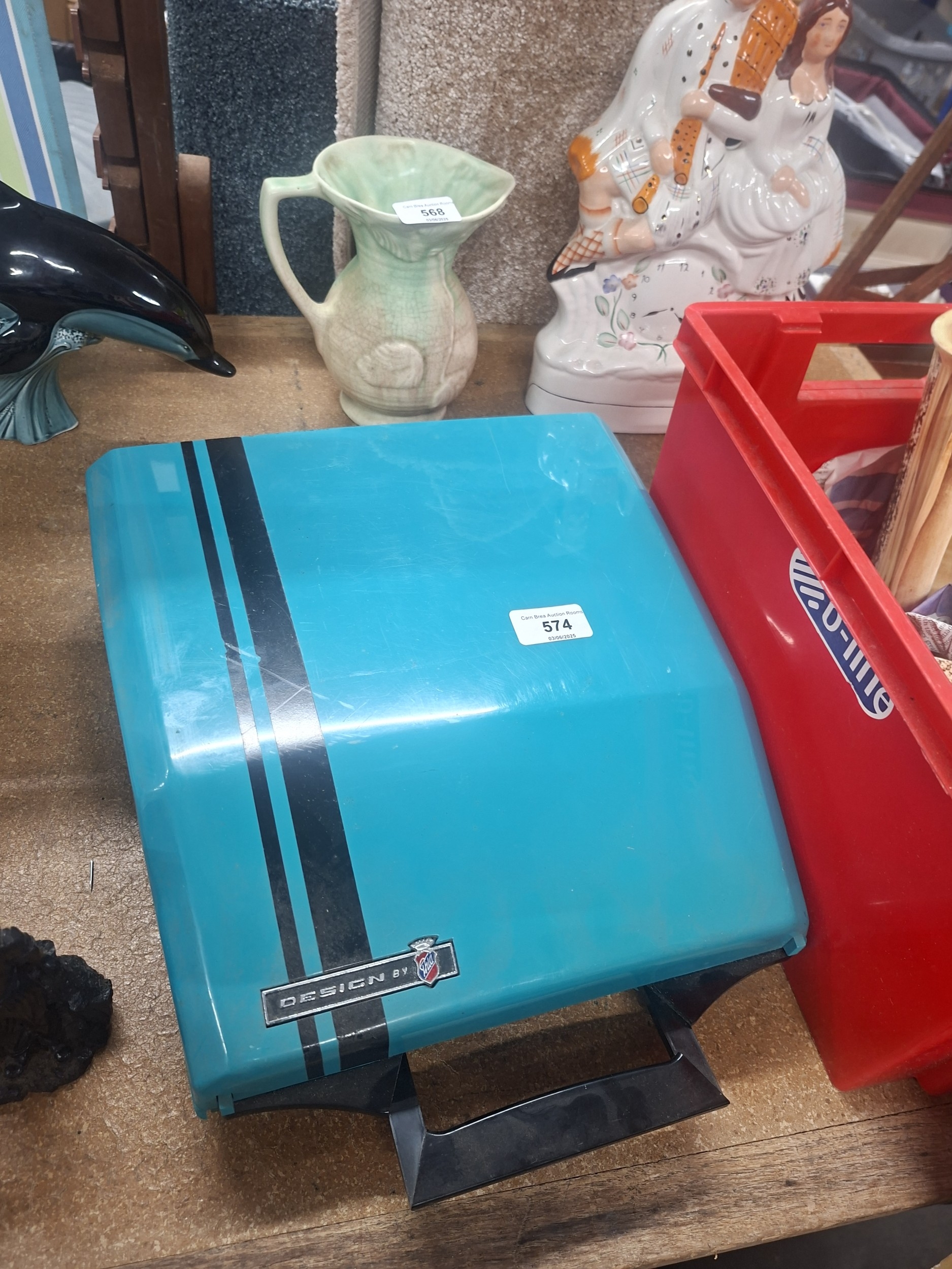 Teal plastic case with black stripes, handle, and silver emblem, showing minor scratches.