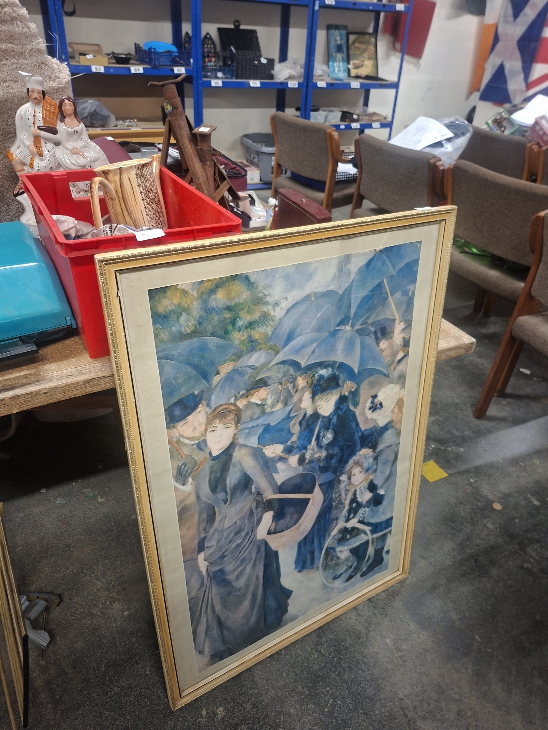 A framed print depicting people with blue umbrellas in muted colors, showing minor wear and discoloration.