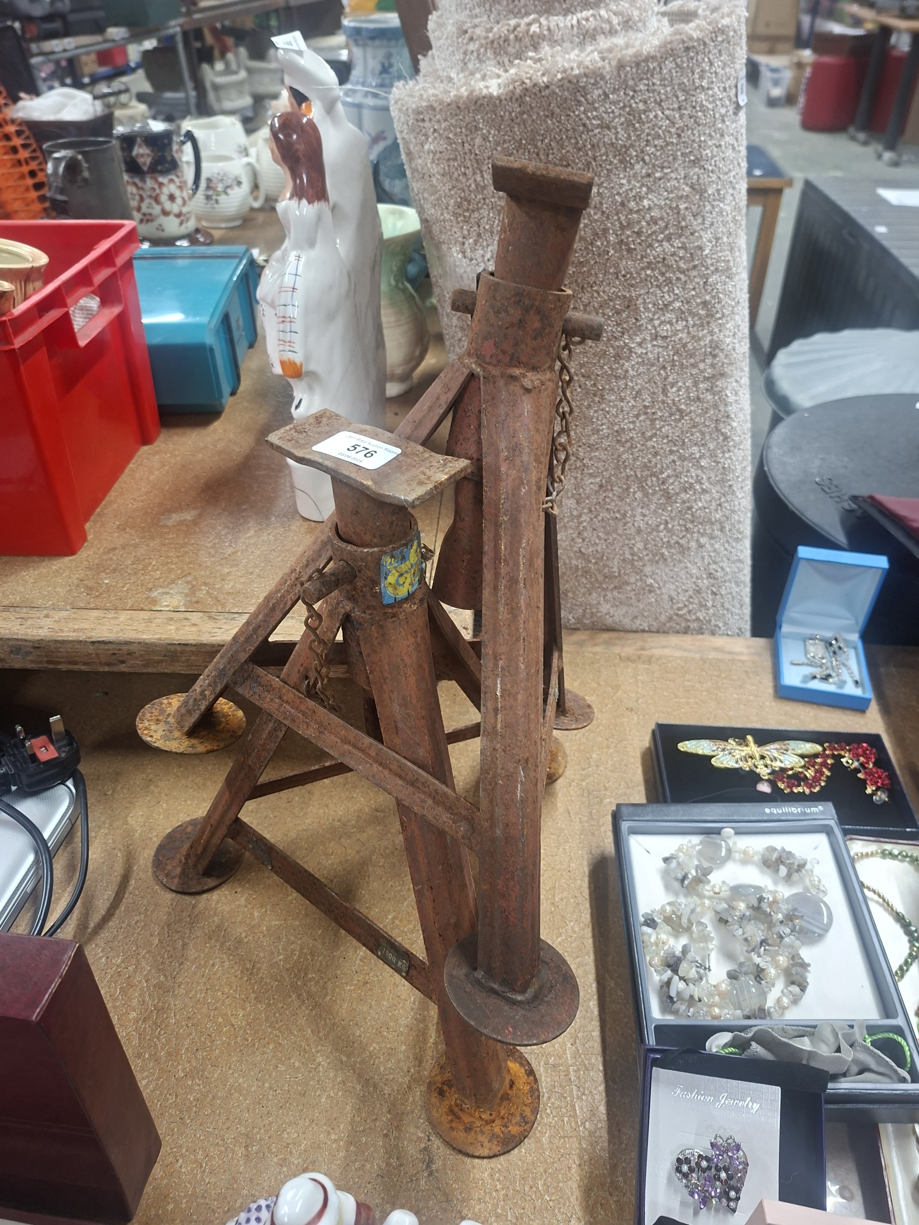 A rusty, three-legged metal tripod jack stand with a chain and minor surface damage.