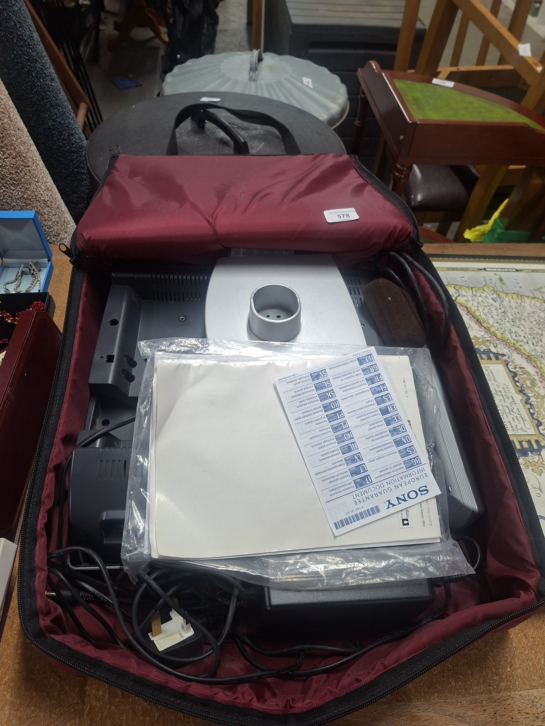 Used Sony flat-screen TV with stand, cables, power adapter, and warranty in a carrying case.