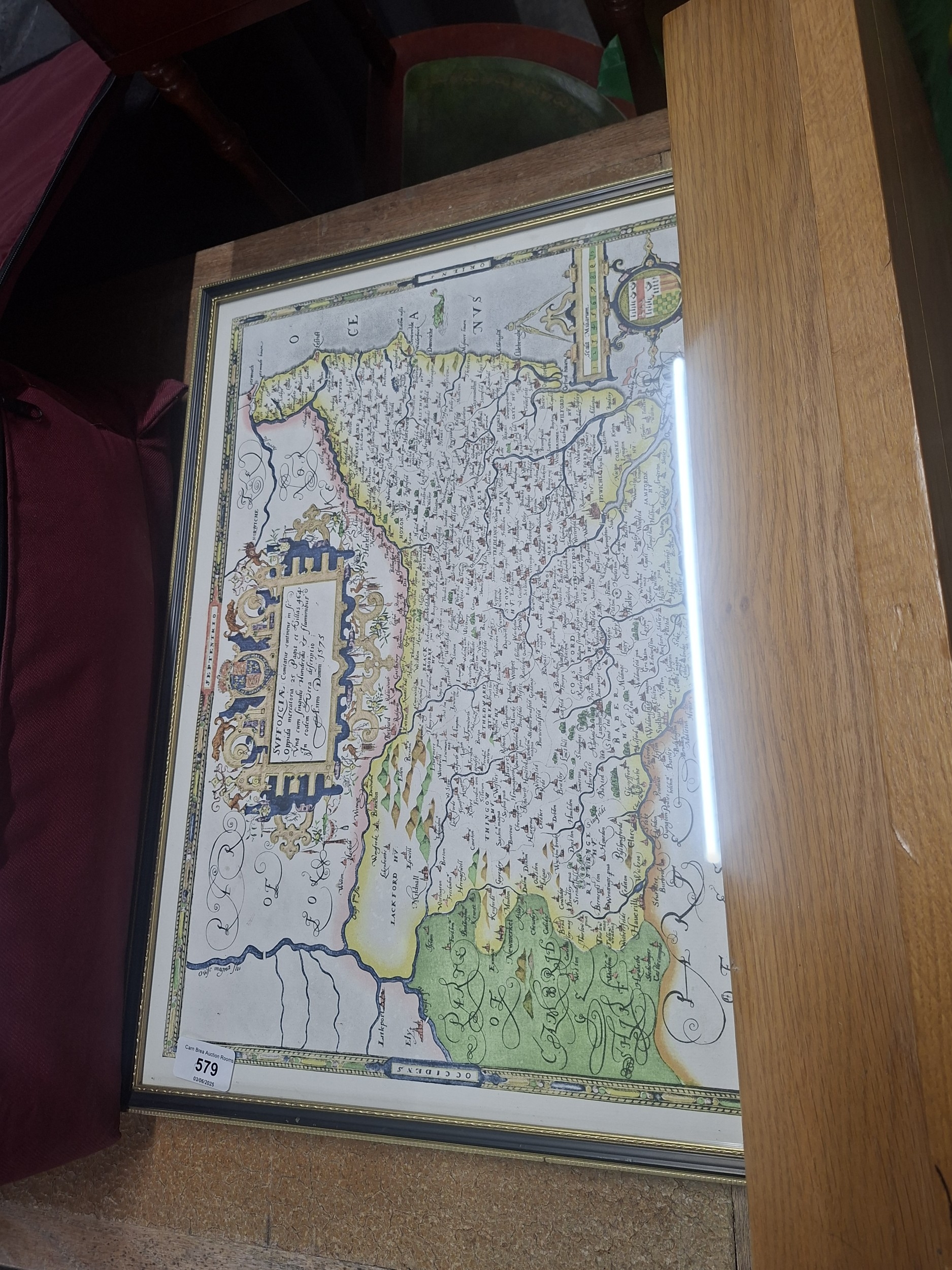 A framed reproduction map with stylized script and illustrations, in good condition.