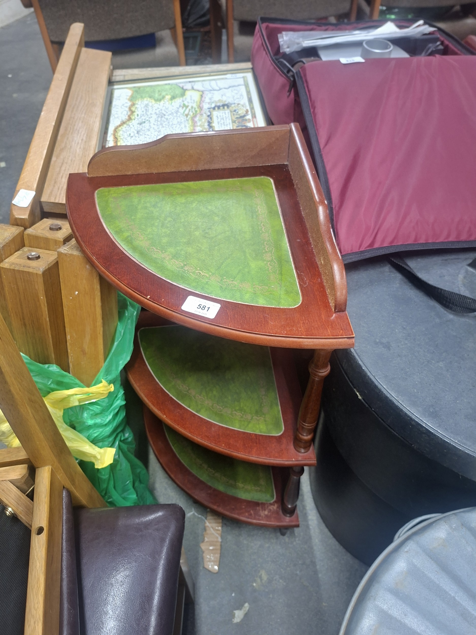 A three-tiered corner table features a dark reddish-brown wood frame and green tops with gold detailing.