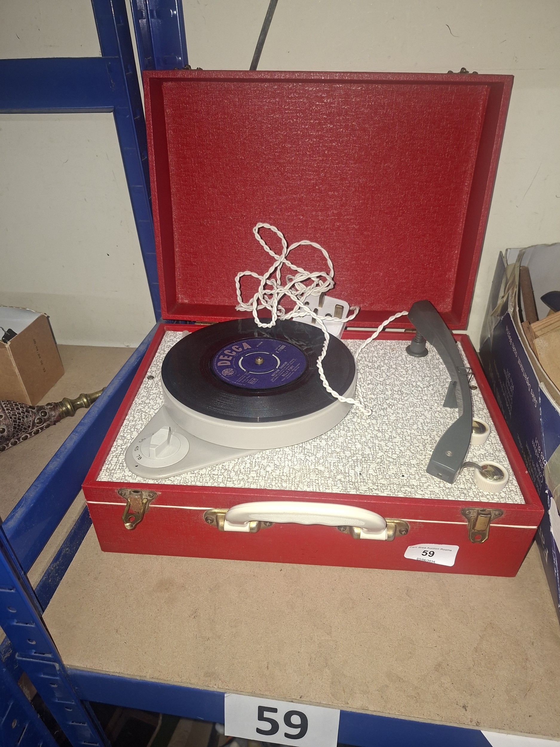 Red carrying case houses a portable turntable with a black vinyl record.