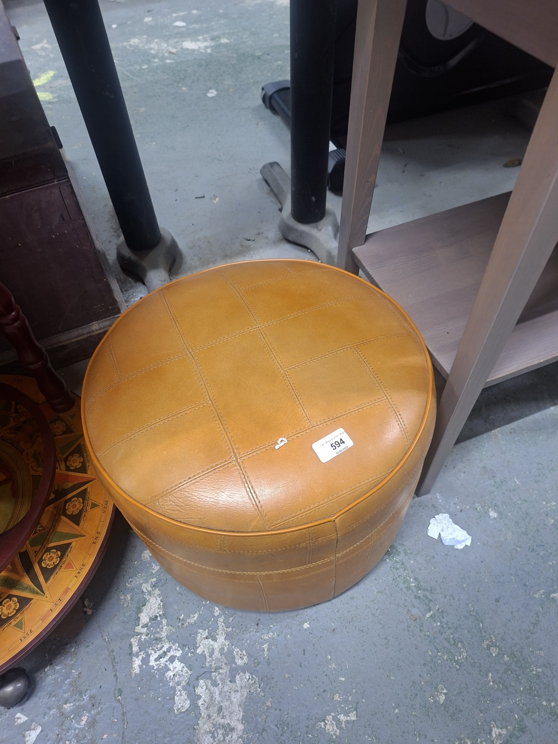 Round mustard-yellow leather ottoman with tufted top, showing minor wear and a small blemish.