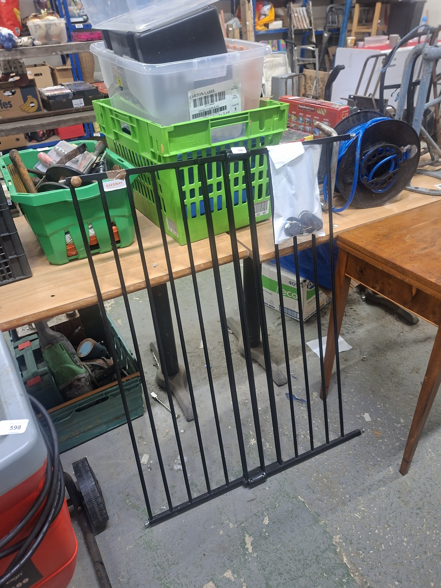 Two-section black metal child safety gate with minor wear and included mounting hardware.