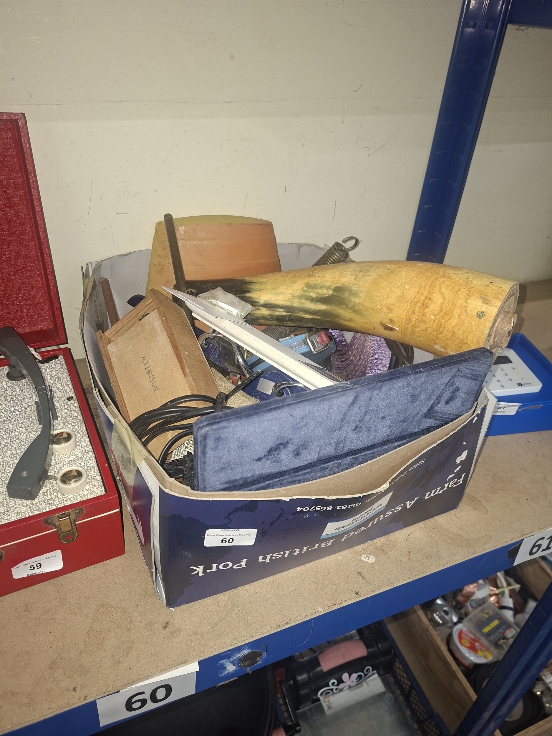 A worn cardboard box contains a horn, small wooden box, velvet item, and miscellaneous contents.