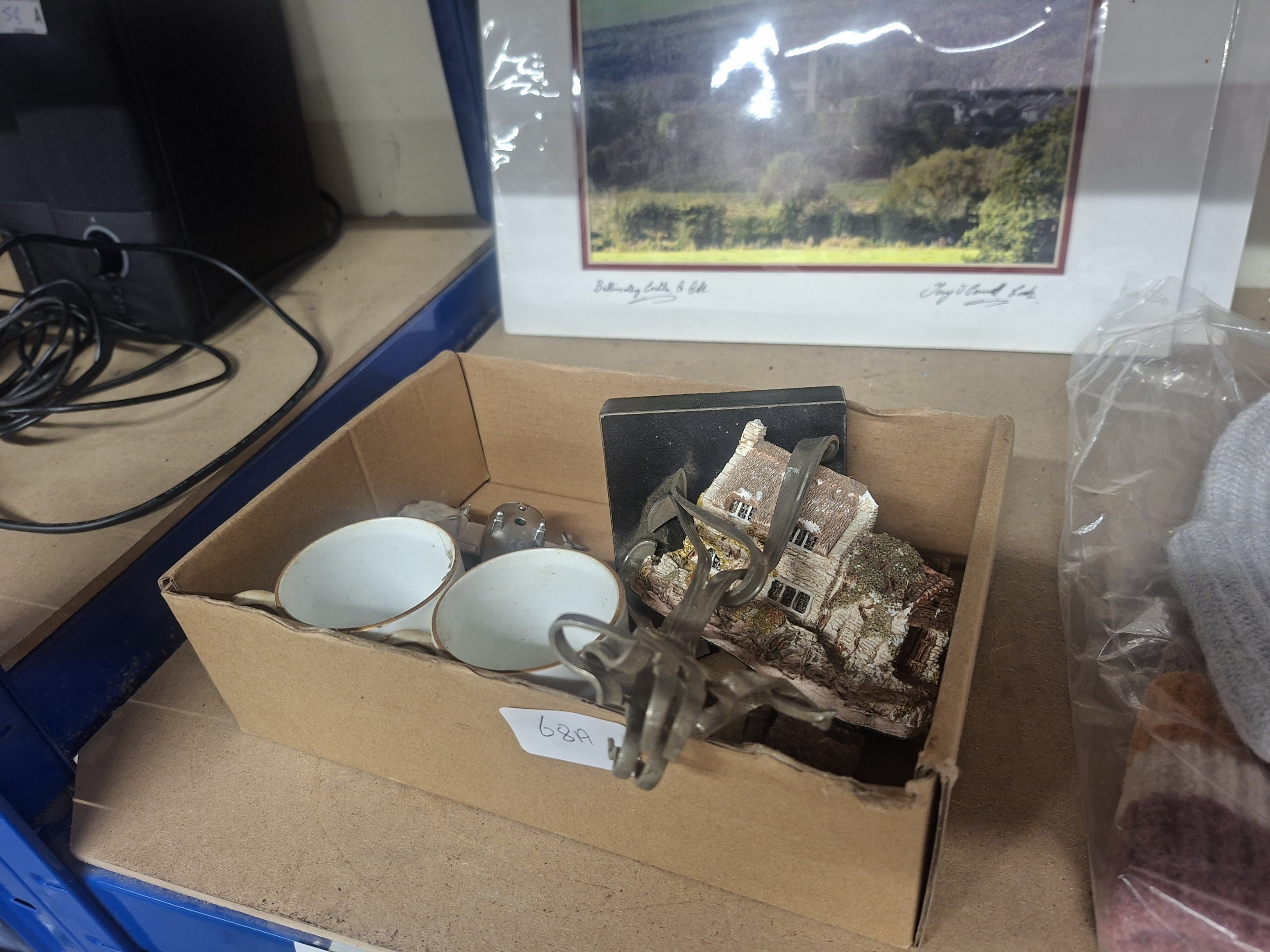 A cardboard box containing two ceramic cups, a cottage figurine, a metallic object, and other items.