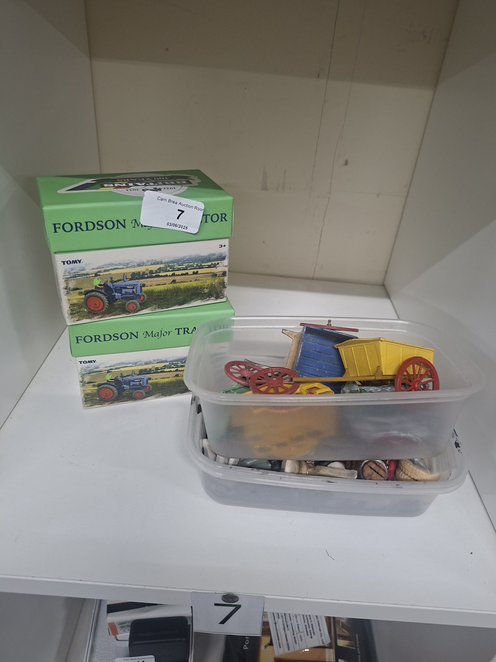 Two unopened TOMY Fordson Major Tractor boxes and a container of assorted small toys.
