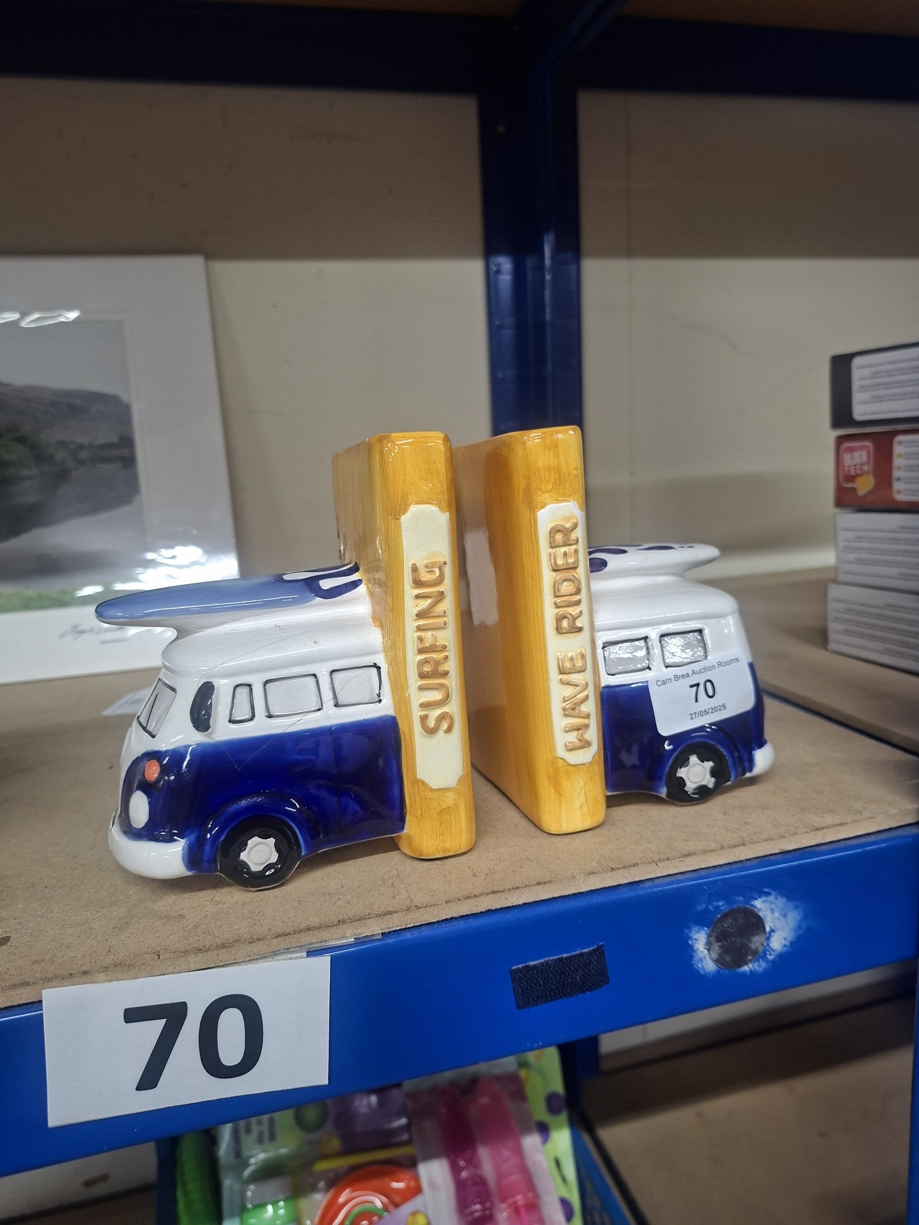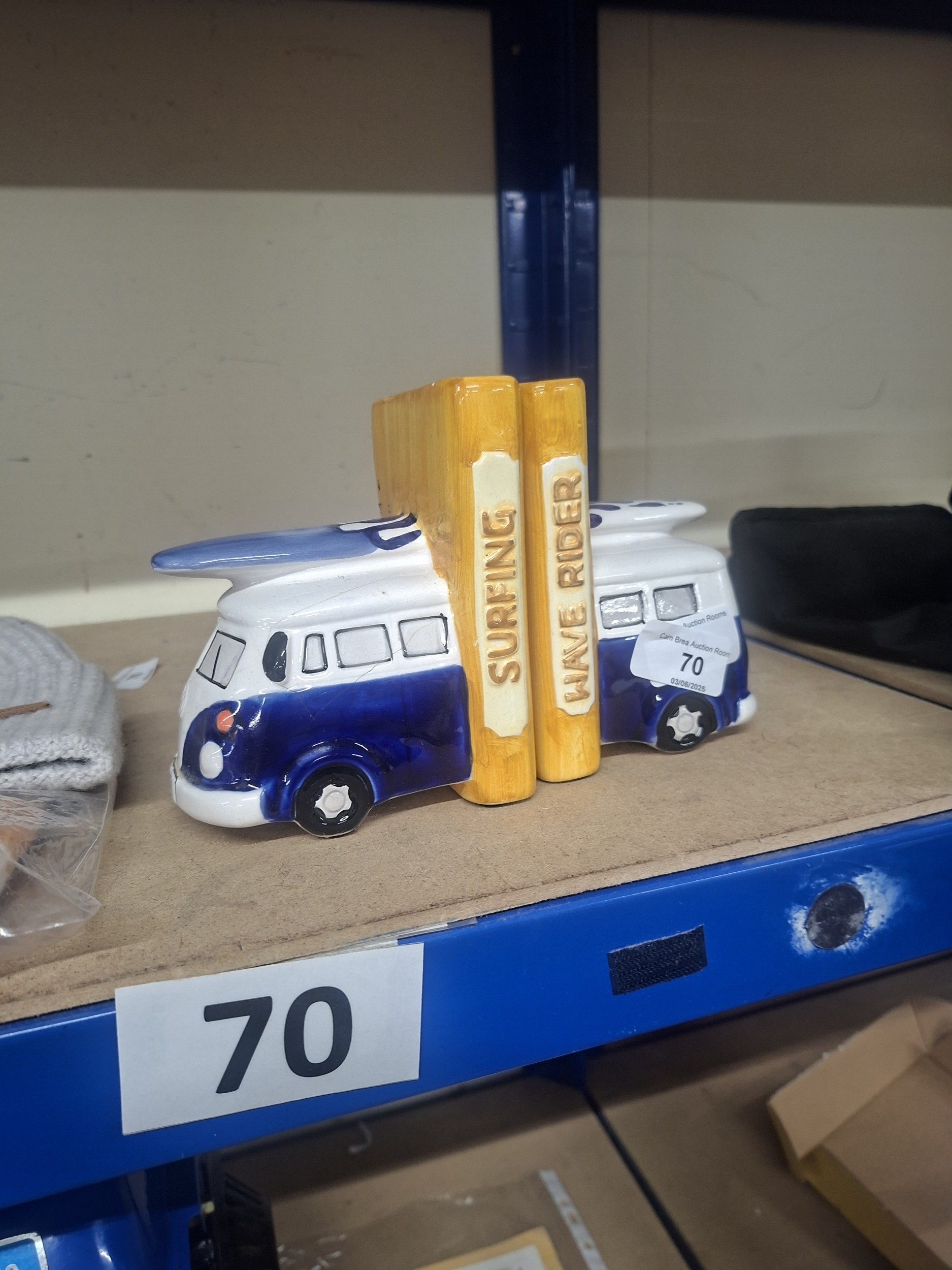 Pair of ceramic VW camper van bookends, white with blue detailing, surfboard on roof, “SURFING” and “WAVE RIDER” markings.