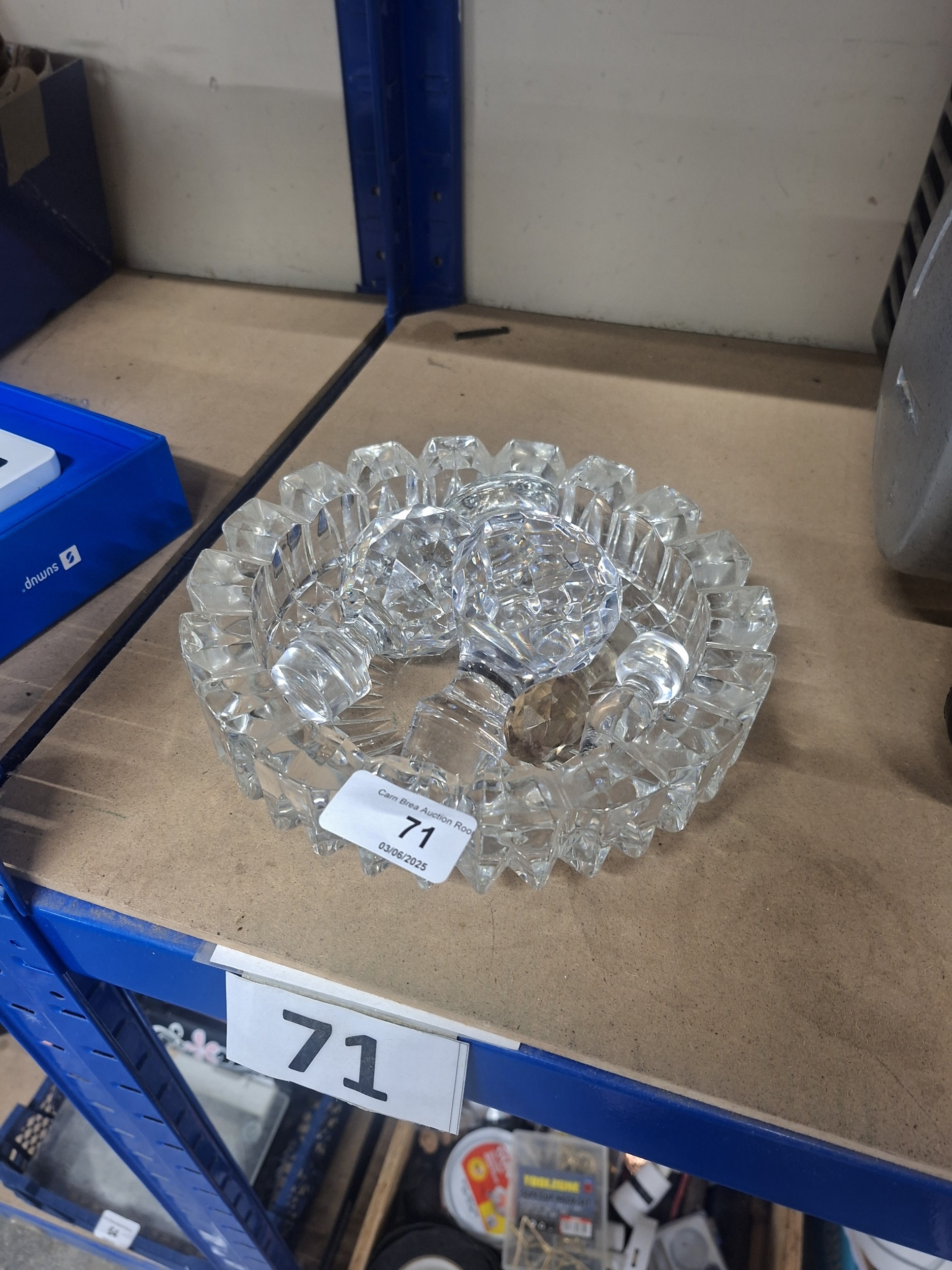 Circular glass ashtray with a faceted geometric design and central pedestal.