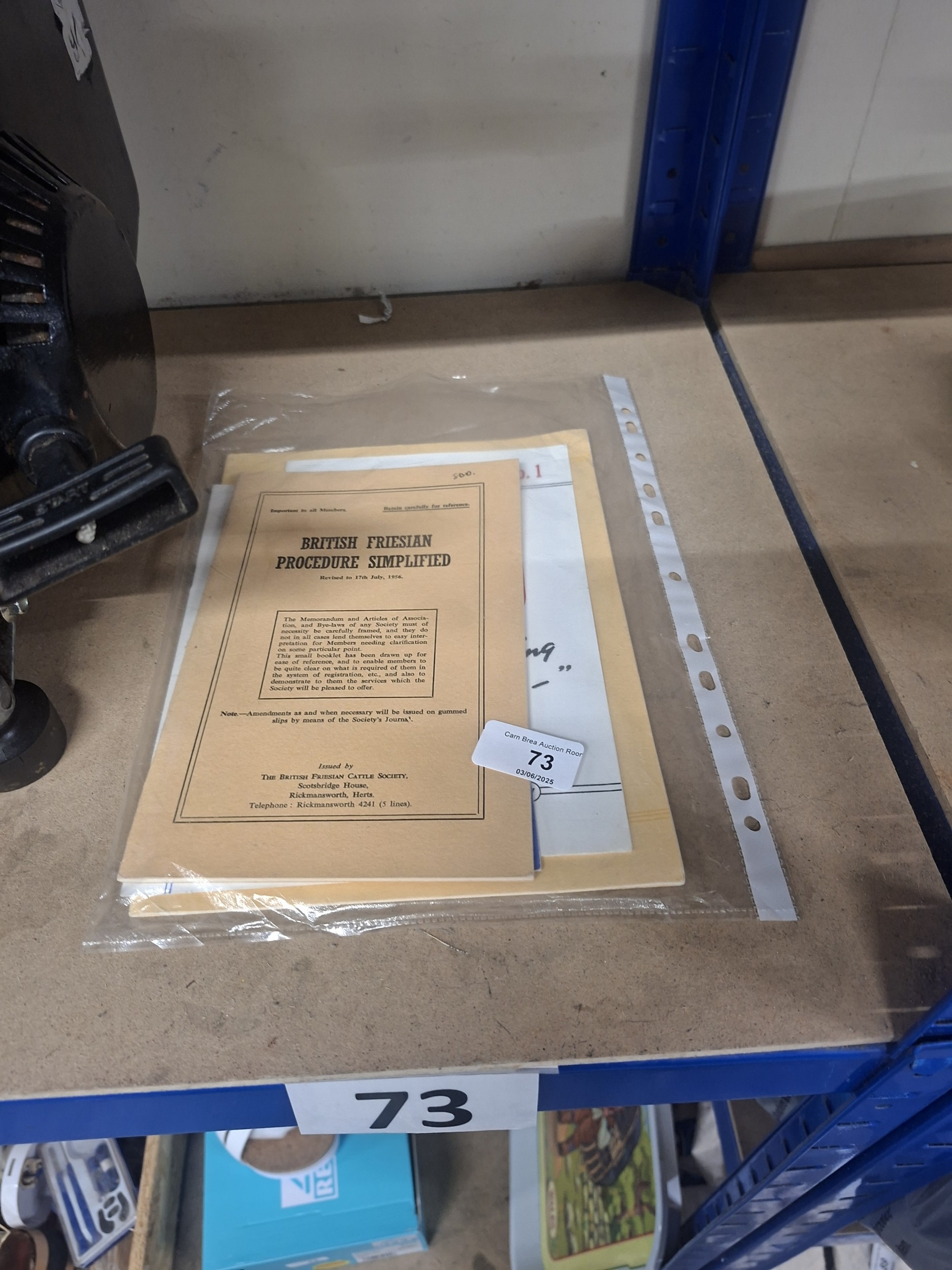 A plastic sleeve containing a 1956 British Friesian cattle breeding manual and other related documents.