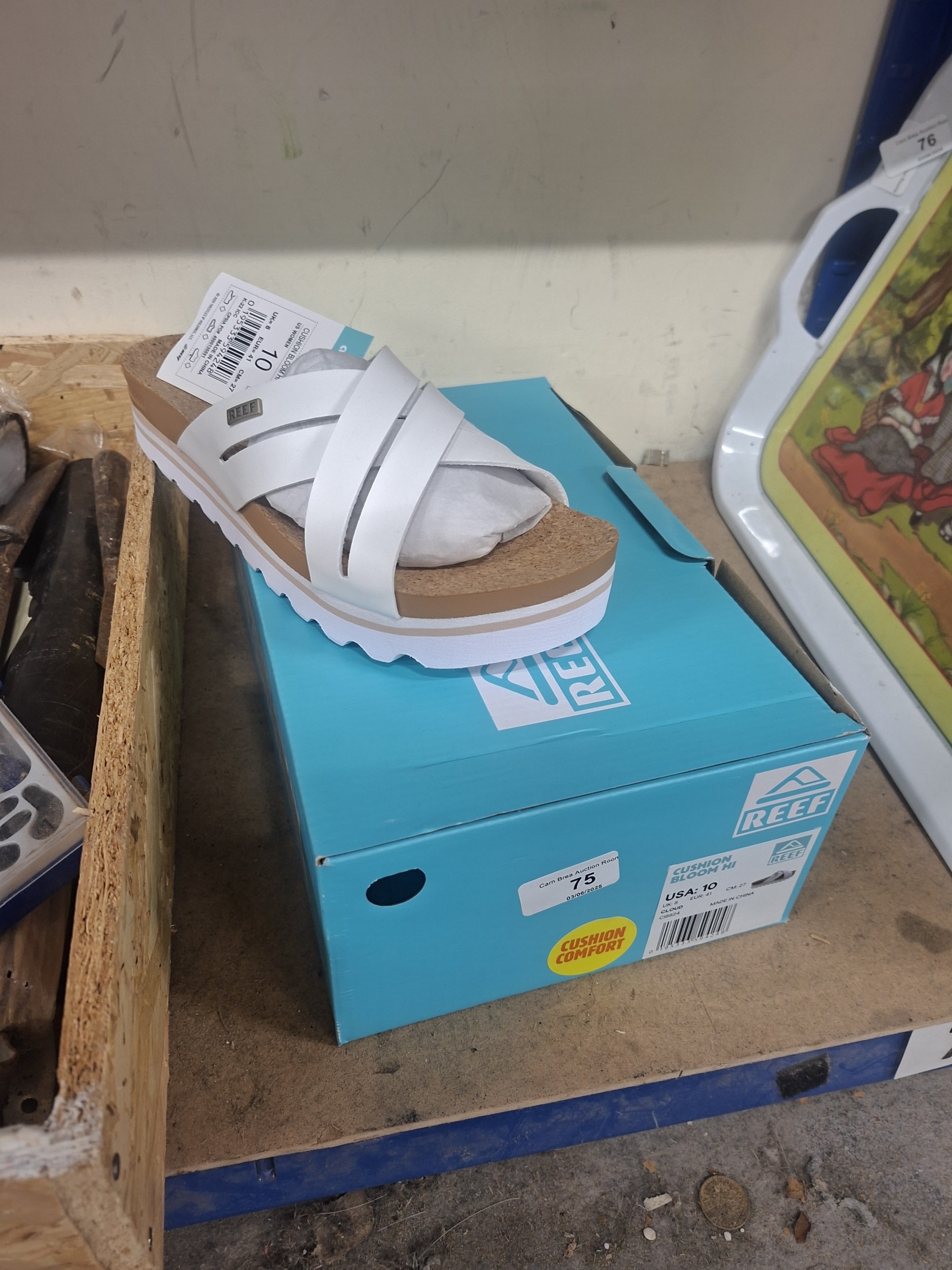 New women’s white leather-look Reef sandals, size 10, in original box.