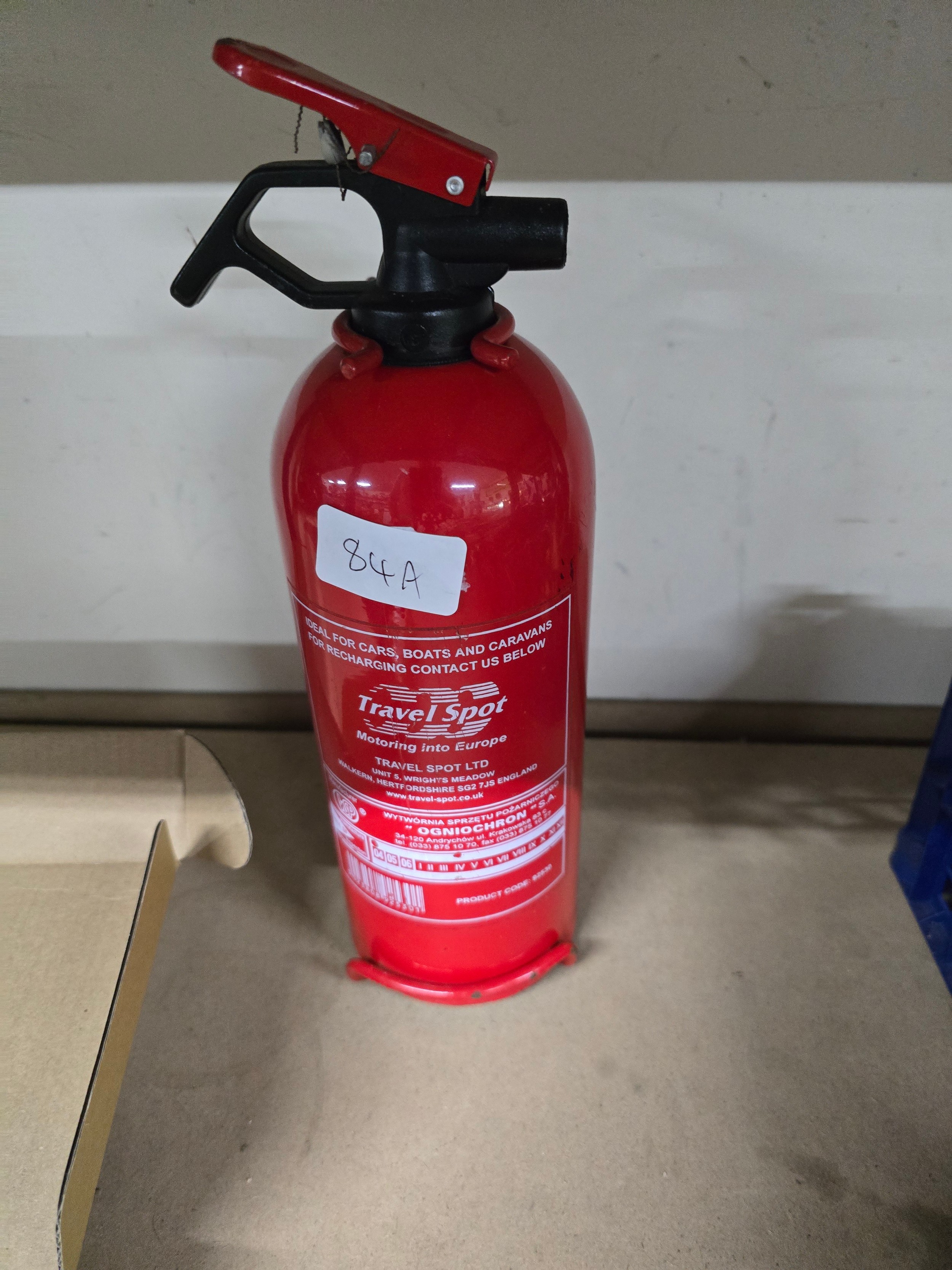 Red cylindrical fire extinguisher with minor scuffs, featuring “Travel Spot Motoring” branding.