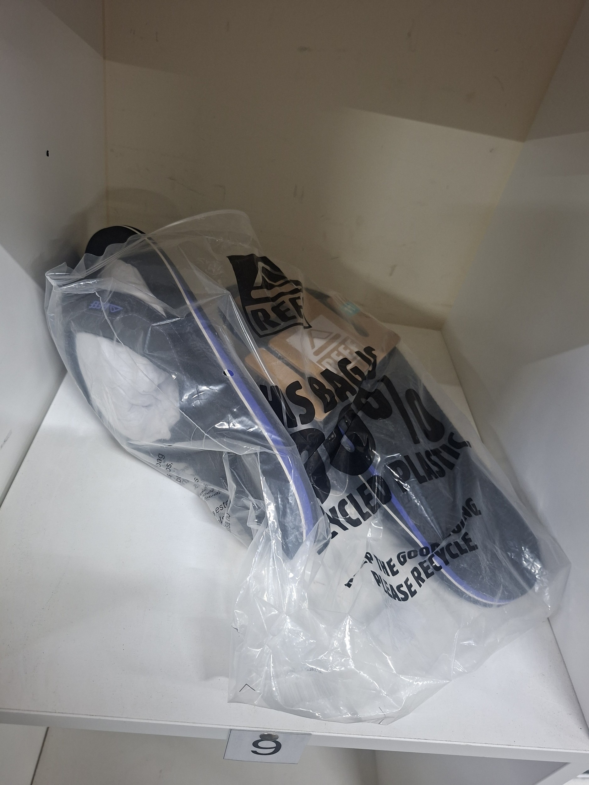 A pair of new black REEF flip-flops with a light blue stripe is in a clear plastic bag.