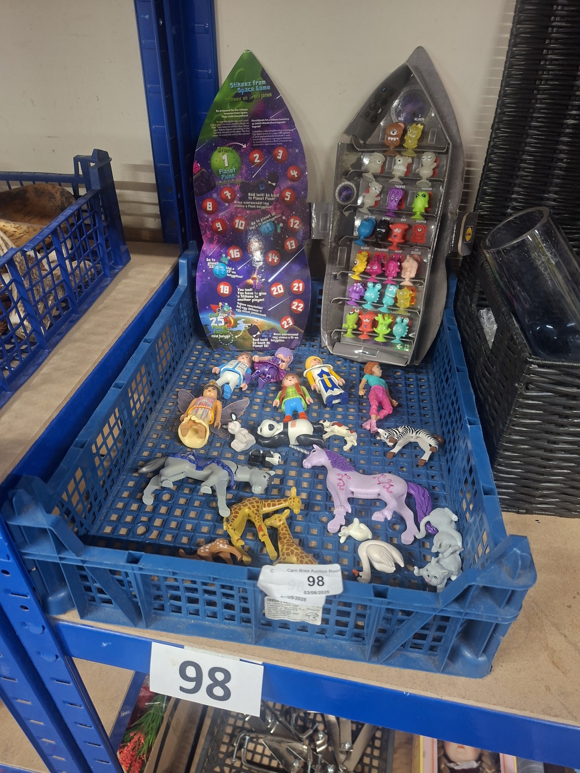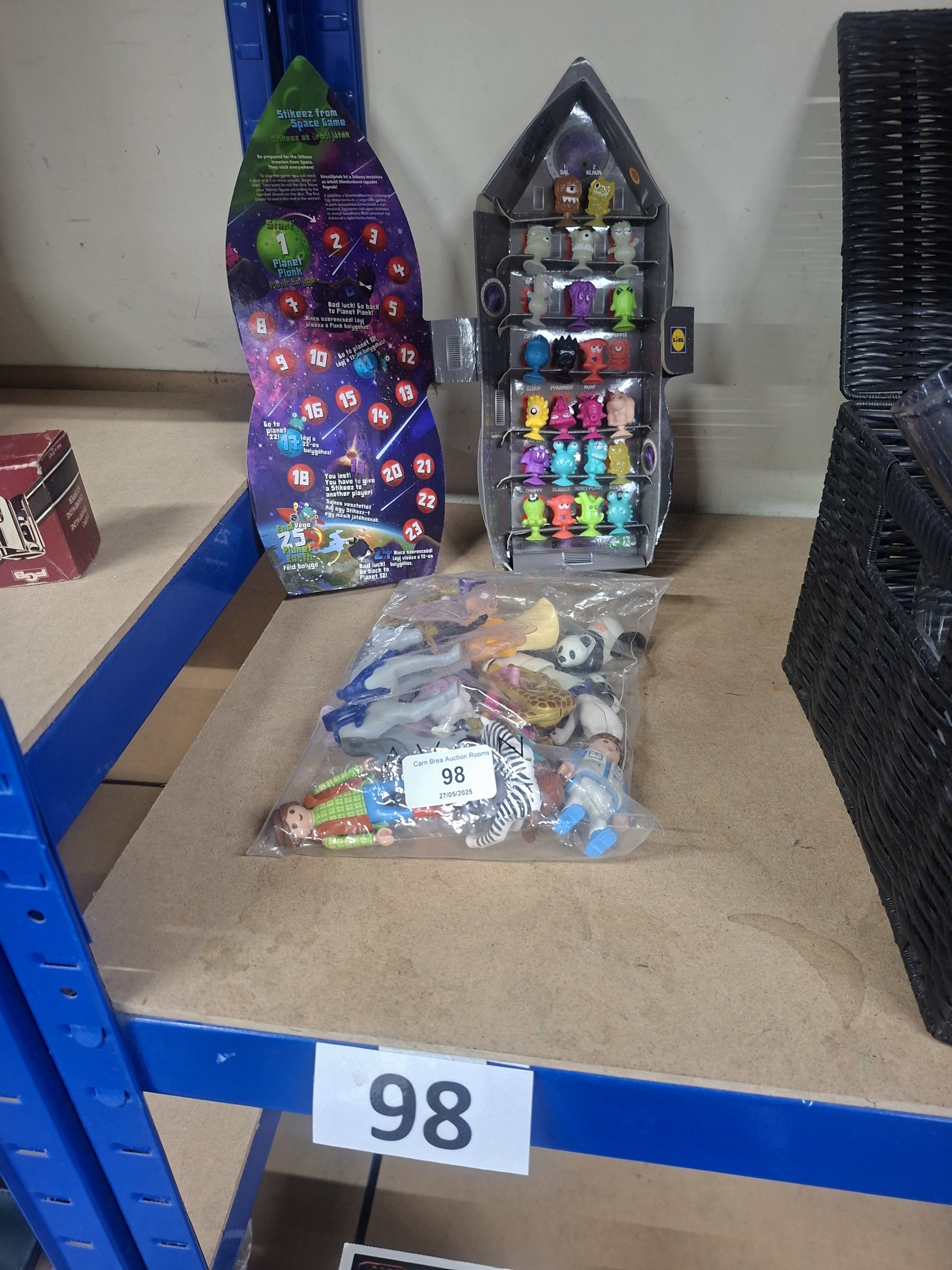 Lot 98 includes a sealed rocket-shaped container of figurines and a bag of assorted animal and human figurines.