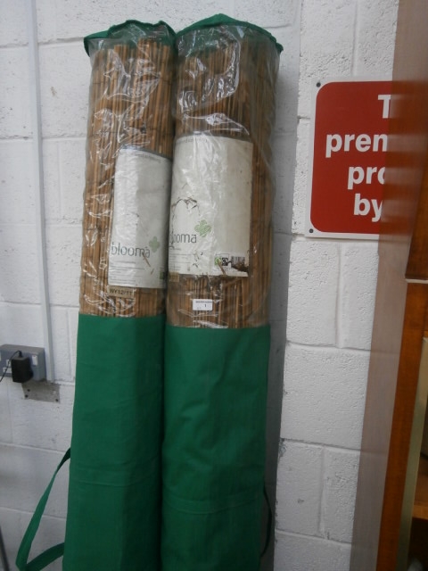 Two Blooma branded rolled items, appearing to be natural reeds or bamboo, are presented in clear plastic packaging on green fabric bases.