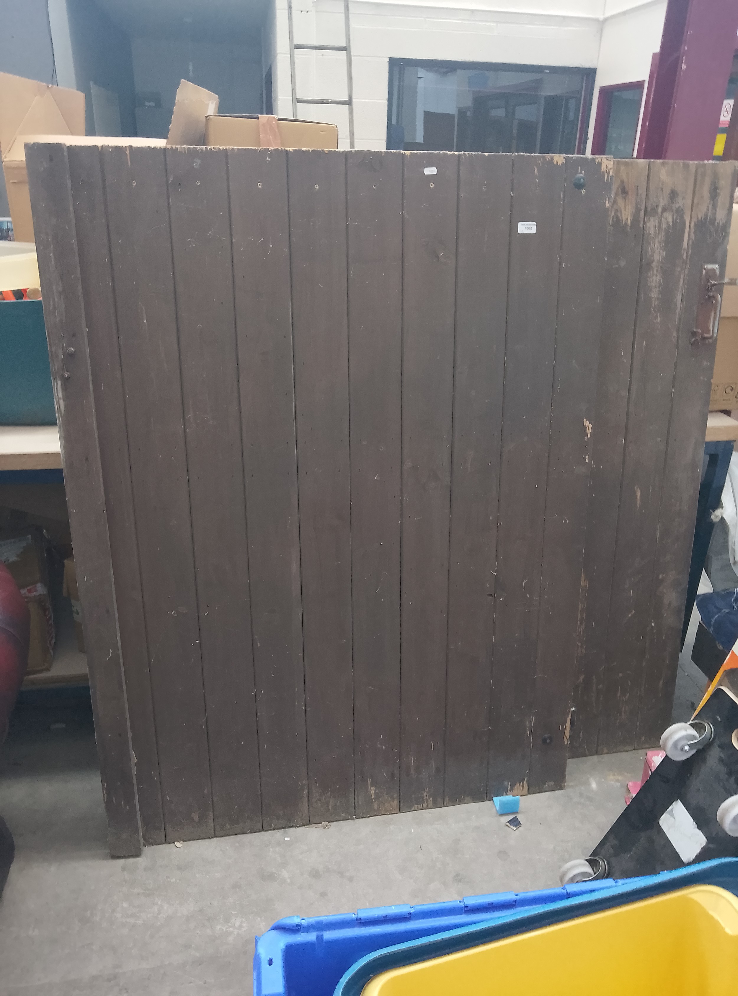 This is a wooden garden gate with vertical planks, a metal handle, and latch.