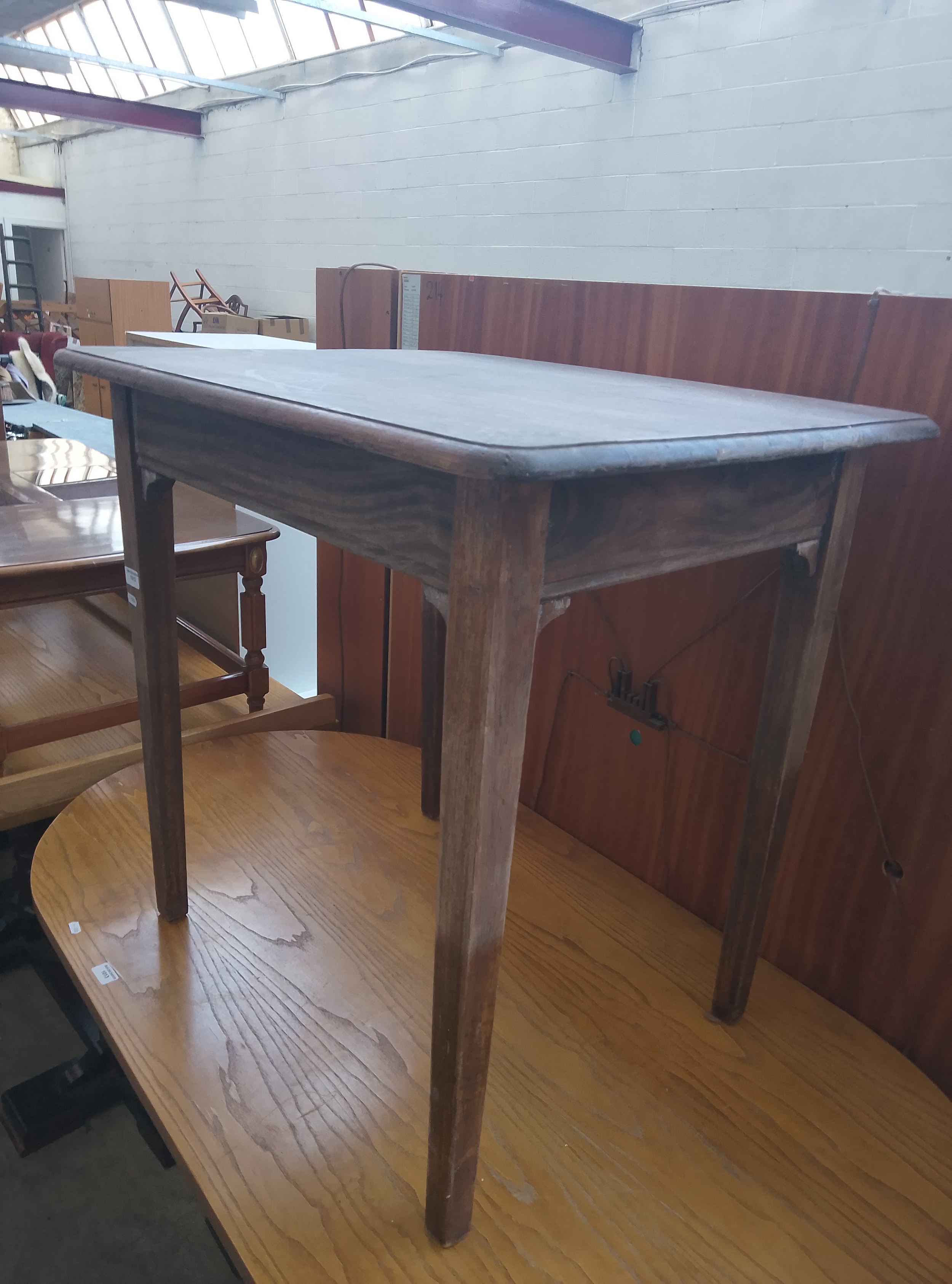 A rectangular wooden dining table with rounded corners and tapering square legs.