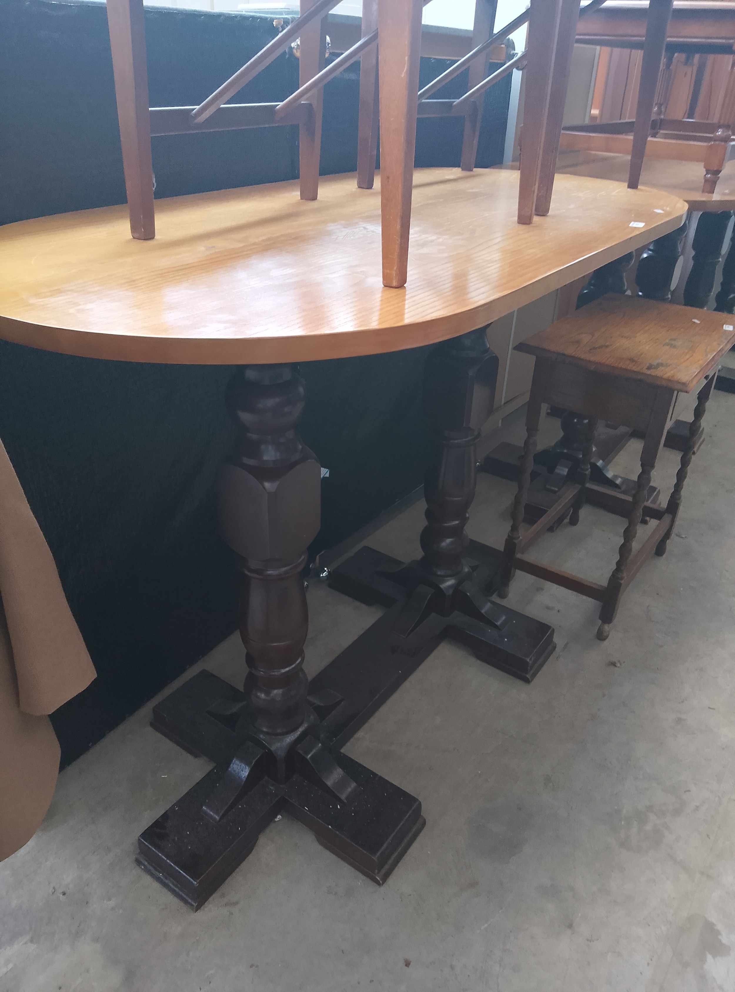 A wooden dining table with an oval light wood top and two pedestal legs, accompanied by a matching side table.