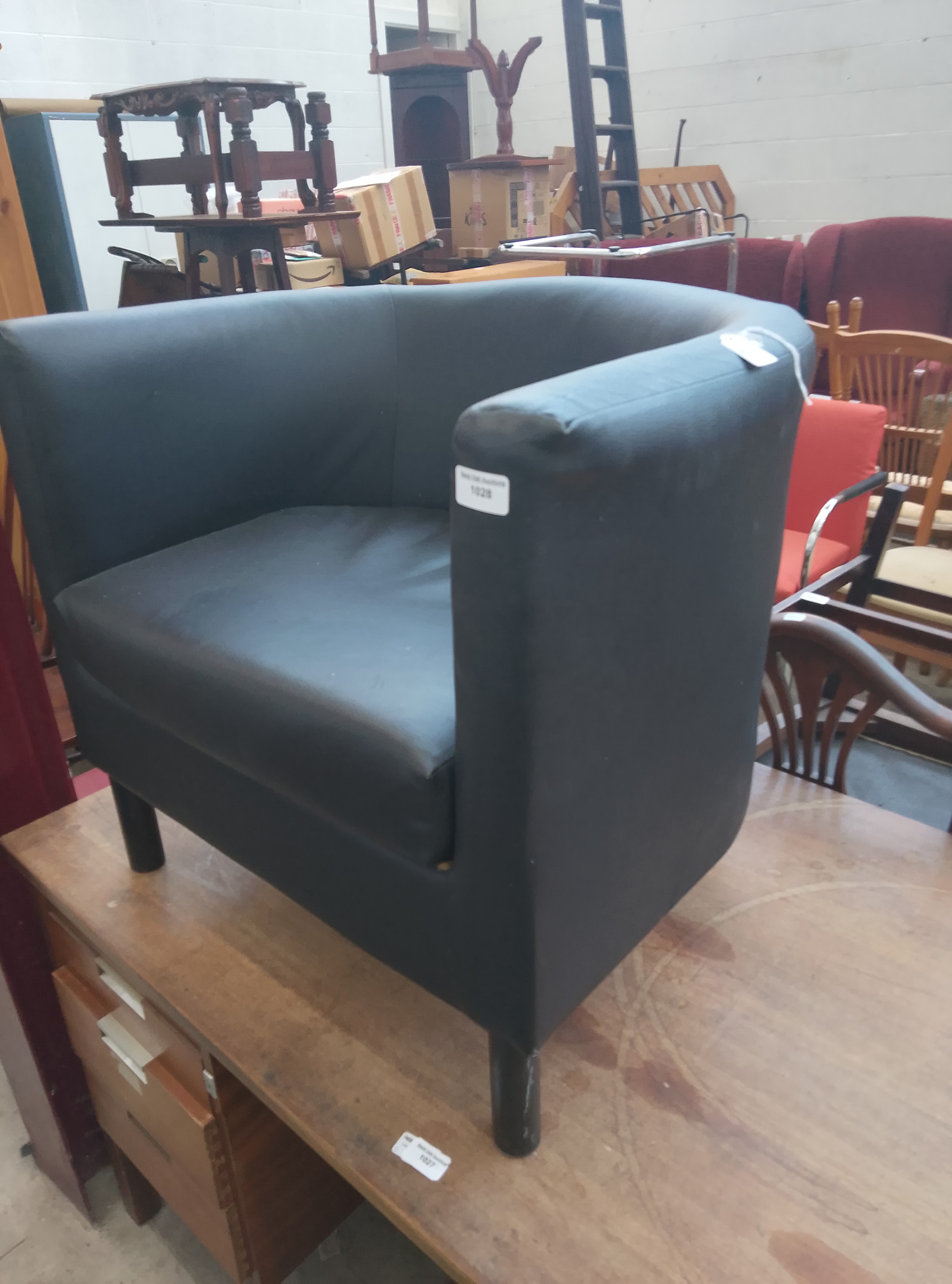 A black upholstered armchair with rounded arms and integrated cushions, featuring four cylindrical legs.