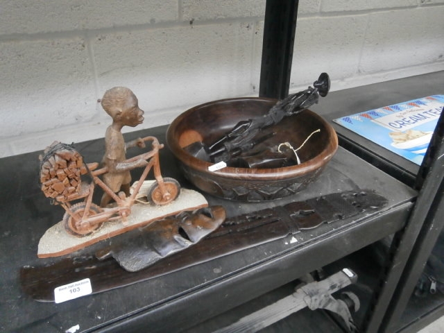 A carved wooden figurine of a person on a bicycle with a load of wood, accompanied by a carved wooden bowl containing slender figures and a flat carved wooden object.