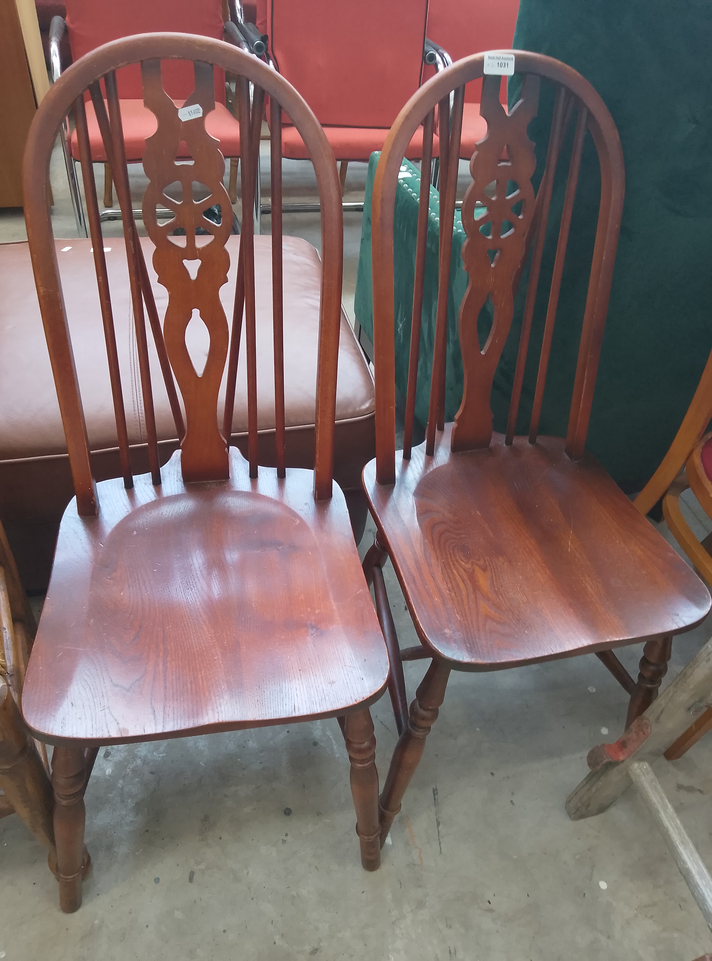 A pair of wooden chairs featuring carved splats, turned legs, and contoured seats.