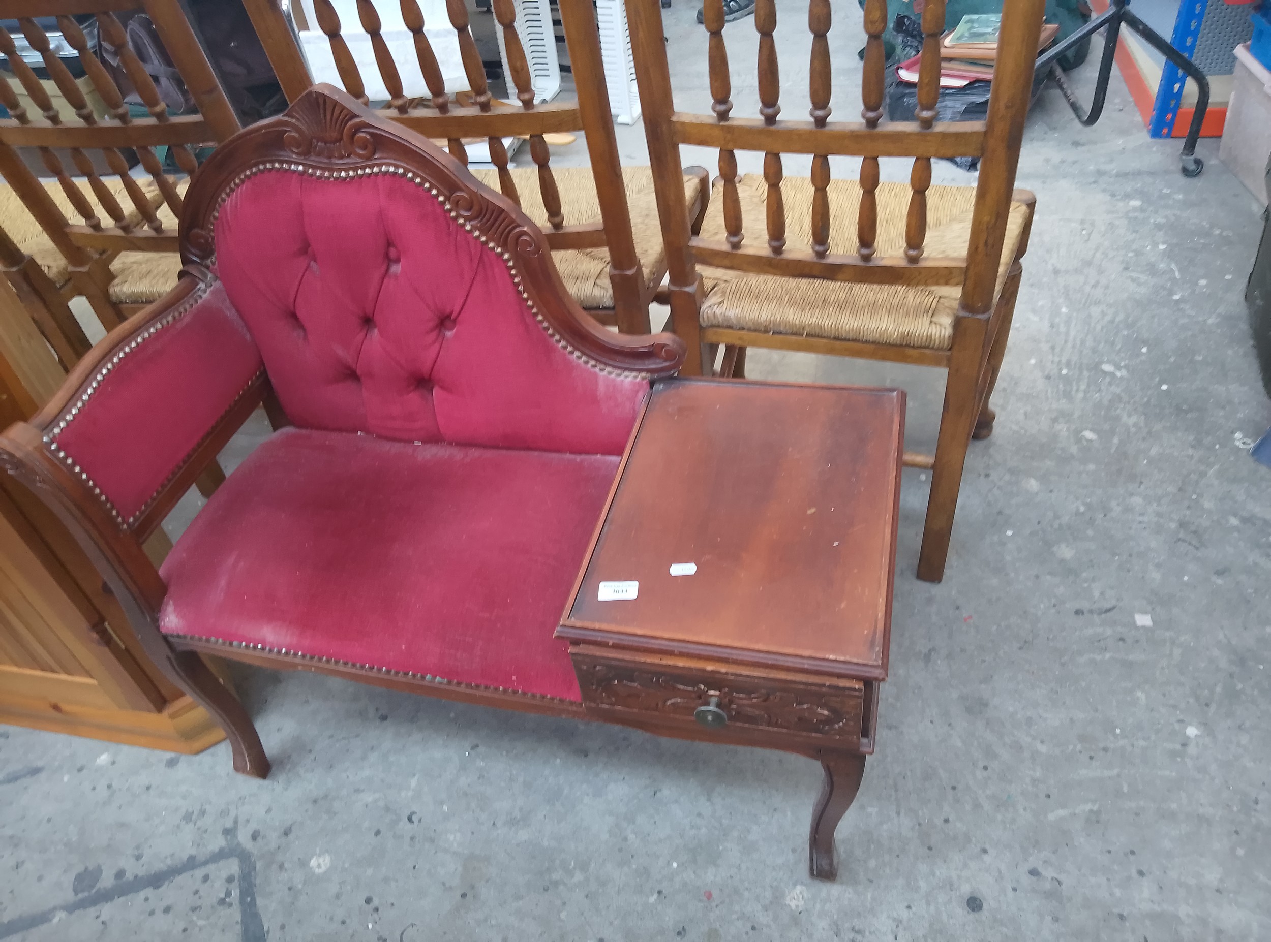 This is a wooden chair featuring red upholstered seating and a curved, tufted backrest with nailhead trim, attached to a small wooden side table with a carved drawer.