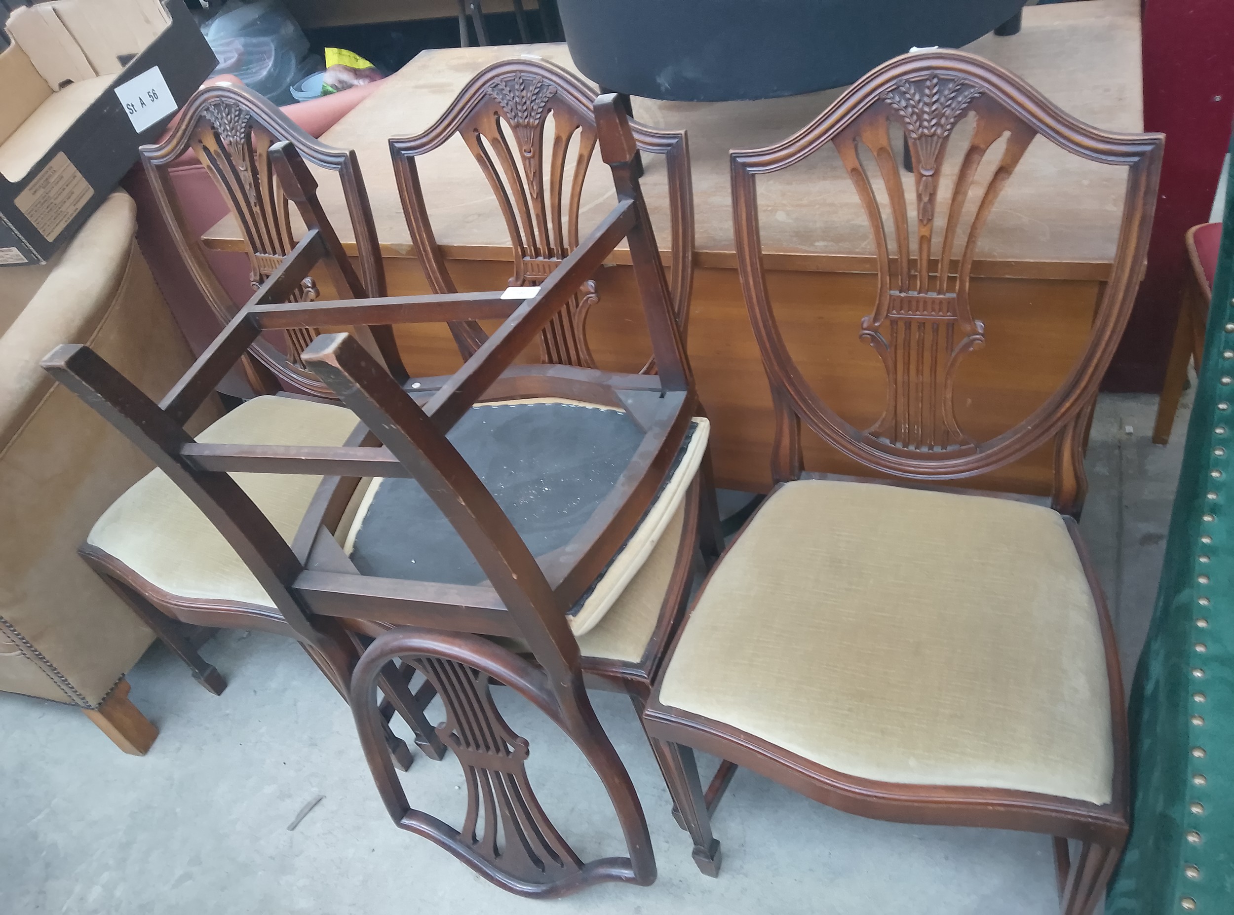 A set of dark wood chairs featuring shield-shaped backs with wheat stalk motifs and light-colored upholstered seats.