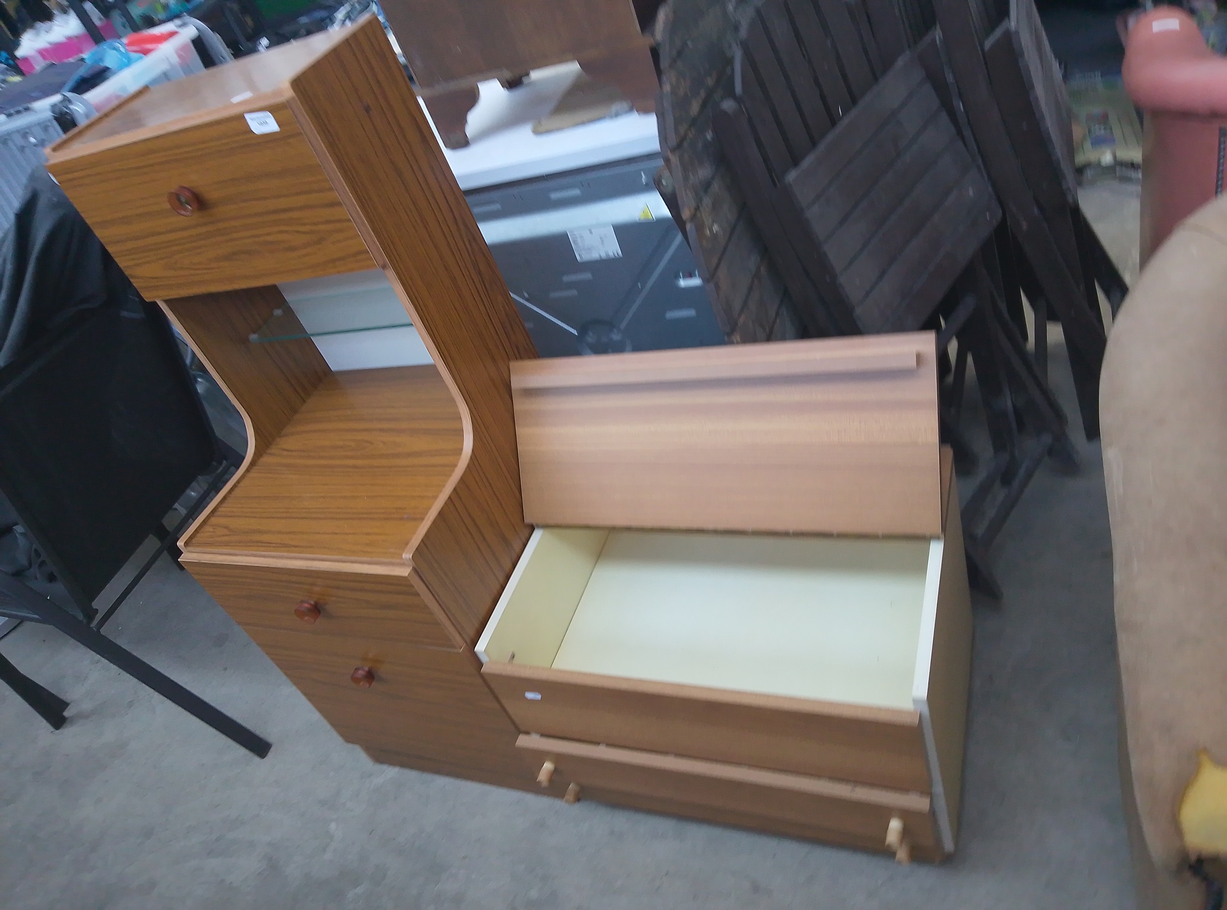 This is a light brown wooden dresser featuring a wood grain pattern, an open shelf with a glass insert, and five drawers of varying sizes.