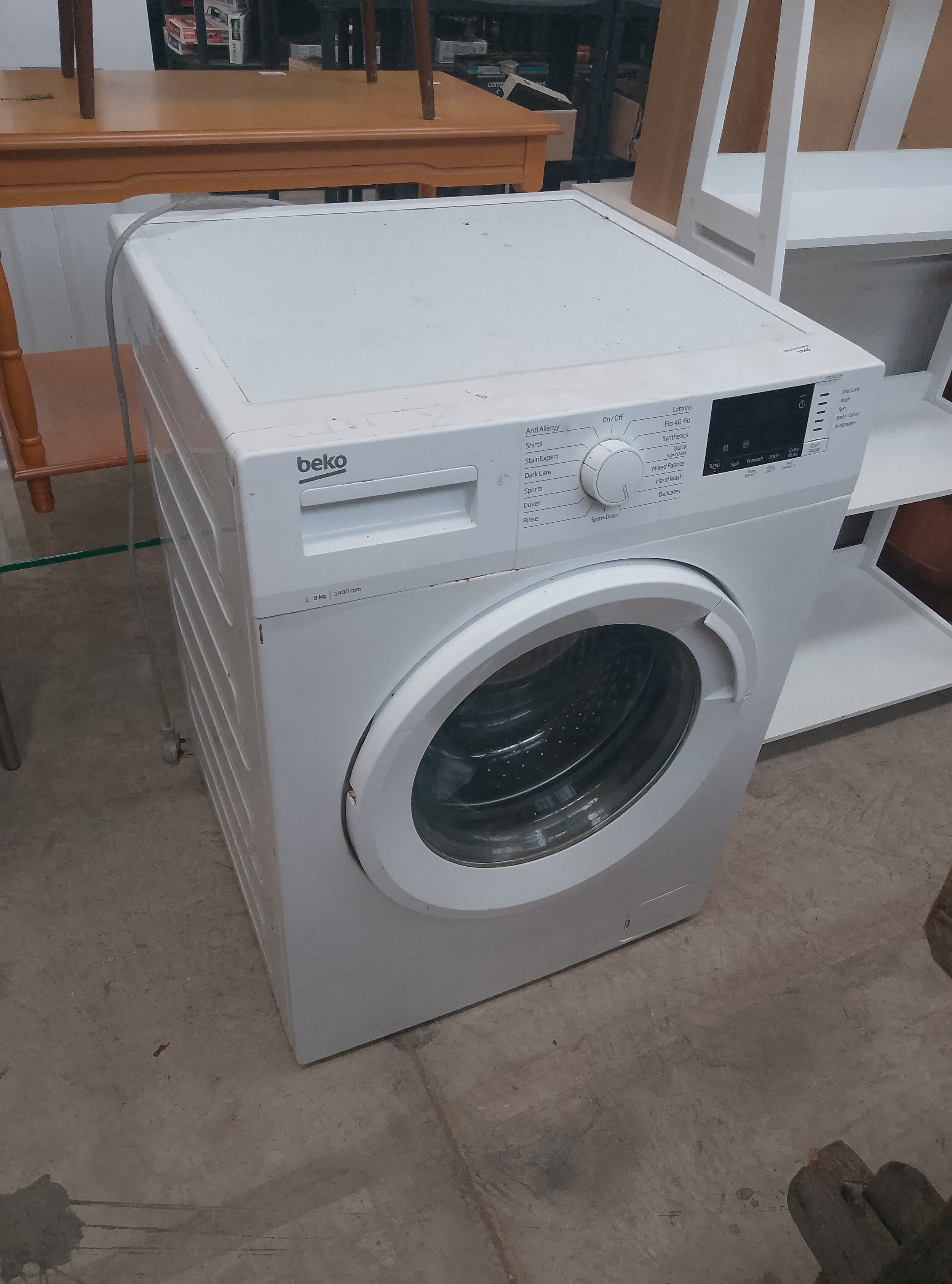 This is a white Beko front-loading washing machine with a 9kg capacity and 1400 rpm spin speed.