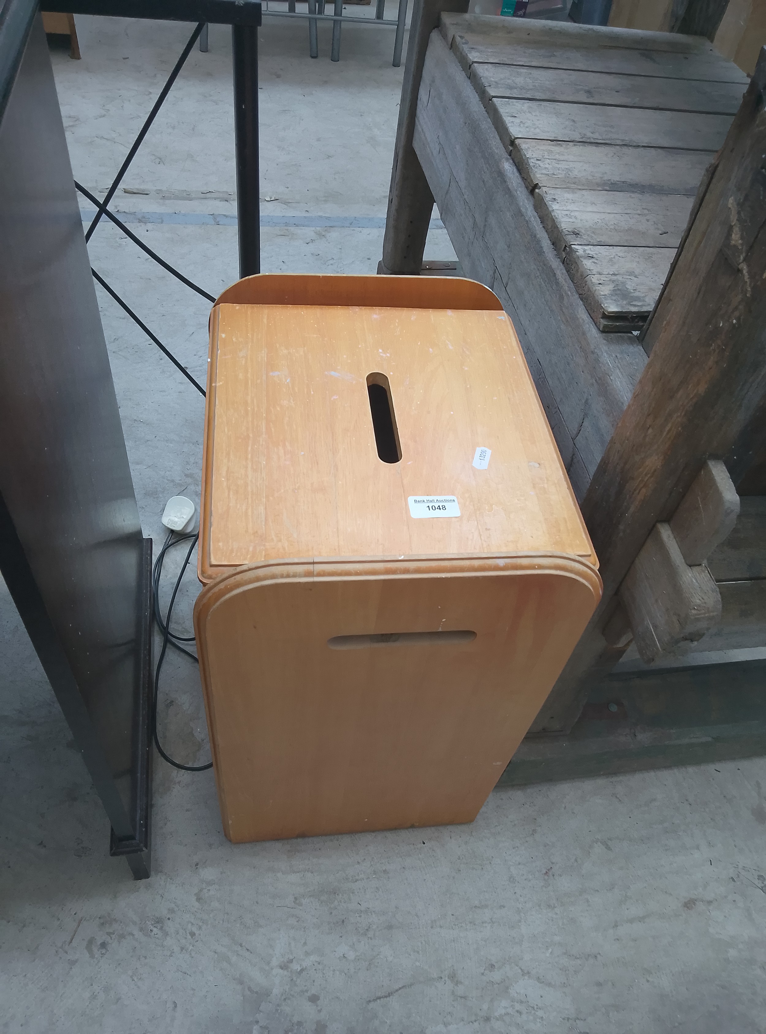 A light-colored wooden box with rounded edges featuring two slots for donations.