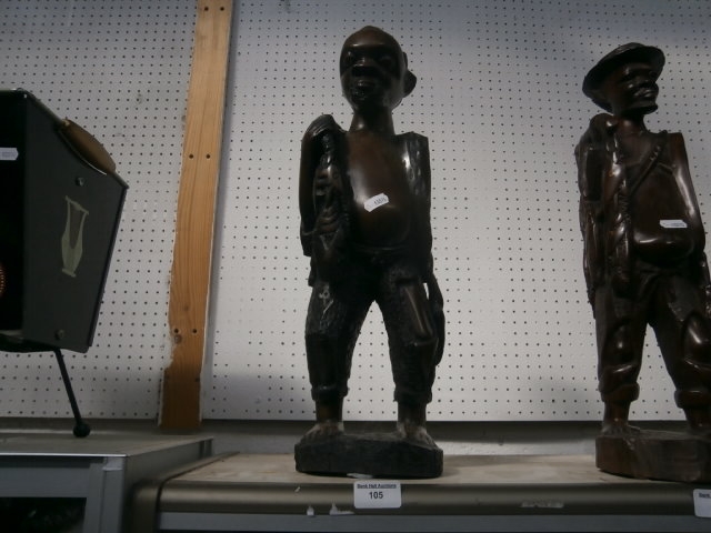 A dark brown carved wooden figurine of a standing male figure holding a bundle over his shoulder, mounted on a rectangular base.